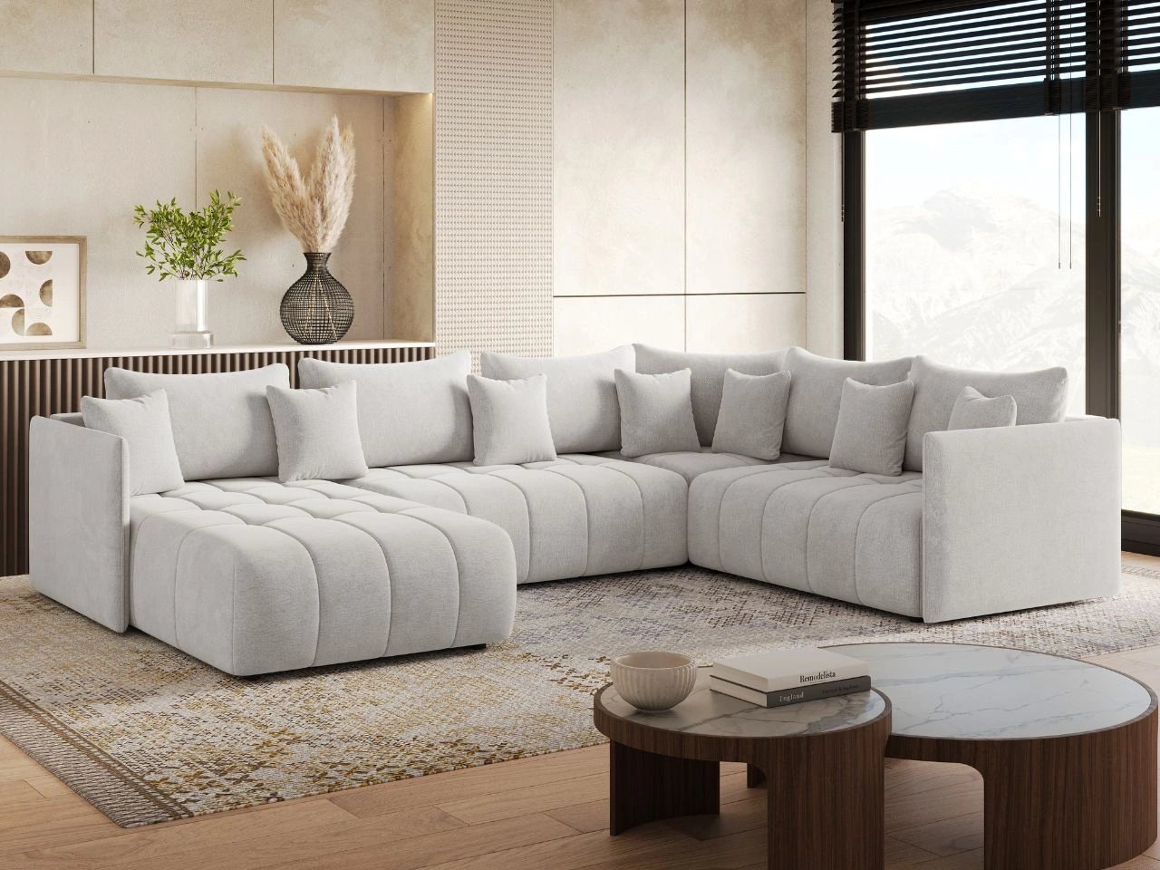 Ecksofa U Ardi Bis ist die perfekte Wahl für diejenigen, die nach einem Möbelstück suchen, das modernes Design mit außergewöhnlichem Komfort und Funktionalität verbindet. Dieses große U-förmige Ecksofa wurde für anspruchsvolle Kunden entworfen, die sowohl Ästhetik als auch praktische Lösungen in ihrem Interieur schätzen. Das Ardi Bis U ist mit einer Schlaffunktion ausgestattet, die eine Liegefläche von 145 x 315 cm bietet, was es zur idealen Lösung für Übernachtungsgäste macht.