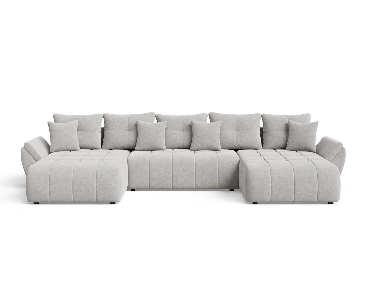 Die Sitzfläche besteht aus einer Kombination aus Wellenfedern und hochelastischem T30-Polyurethanschaum, was für hervorragenden Sitzkomfort, Stabilität und Langlebigkeit sorgt. Die Rückenlehne wird von neun Kissen gebildet – fünf großen und vier kleineren – die für ein angenehmes, weiches Anlehnen sorgen. Eine besonders praktische Funktion des Decor U Ecksofas ist die integrierte Schlaffunktion, die eine große und bequeme Liegefläche von 133 × 335 cm bietet. Das Ausziehen funktioniert dank des DL-Mechanismus schnell und mühelos. Zusätzlich steht ein geräumiger Bettkasten zur Verfügung, ideal zur Aufbewahrung von Bettwäsche.