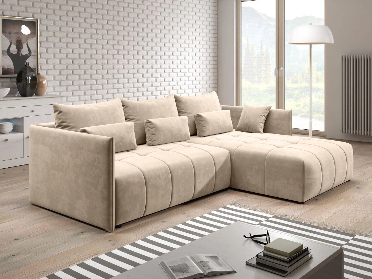 Das präsentierte Modell ist ein universelles Möbelstück, was bedeutet, dass die Ottomane sowohl auf der linken als auch auf der rechten Seite montiert werden kann. Das Ecksofa Ardi ist außerdem mit einer Schlaffunktion und einem geräumigen Bettkasten ausgestattet. Die Umwandlung des Sofas in ein Bett ist dank des DL-Automatikmechanismus, der das Aufklappen erleichtert, äußerst einfach. Das L-förmige Ecksofa Ardi passt perfekt in jedes Interieur, und die verwendeten Materialien garantieren eine lange Lebensdauer des Möbels.