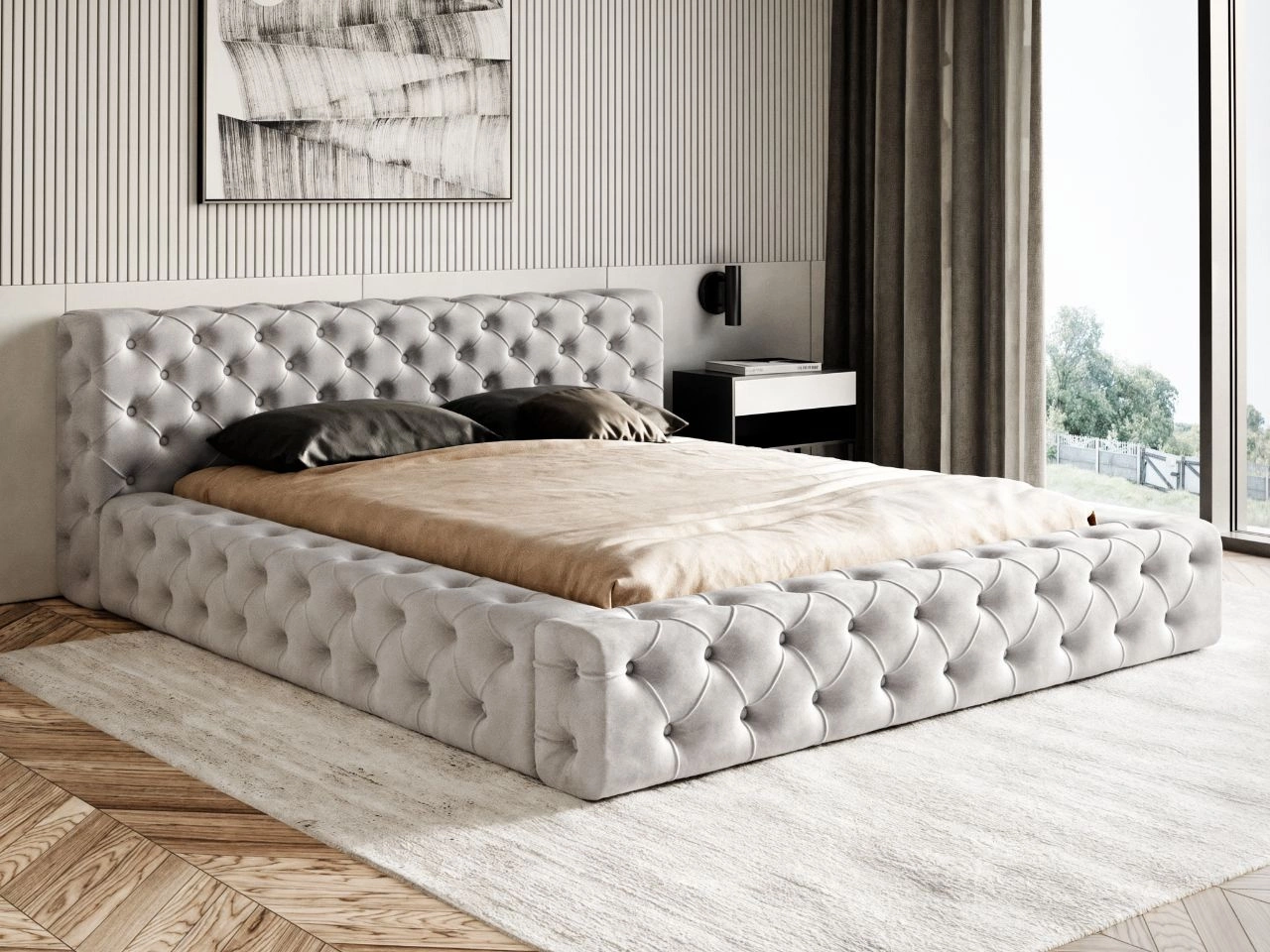 Das Polsterbett Palini ist ein sehr interessantes Möbelstück, das durch sein Design direkt an den Glamour-Stil erinnert. Dies wird durch das tiefe Steppmuster auf allen Teilen des Bettes unterstrichen. Das massive Kopfteil sieht nicht nur gut aus, sondern erfüllt auch eine praktische Funktion, da es beim Fernsehen oder Lesen eine bequeme Rückenstütze bietet.