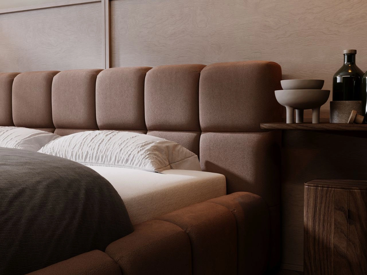 Eine Besonderheit dieses Möbels ist seine Konstruktion. Bei der Herstellung wurde ein dicker Schaumstoff verwendet, der den Bettrahmen perfekt ausfüllt und dem Möbel eine einzigartige Form verleiht. Die Seitenteile des Bettes sind so dick, dass man zum Beispiel sein Handy darauf ablegen kann. Das weiche und schön gesteppte Kopfteil ist ein funktionelles Designelement des Bettes, da es beim Lesen oder Fernsehen eine hervorragende Rückenlehne bietet. Darüber hinaus hat das Bett mit Lattenrost 180x200 Alicante dekorative Quadrate am Kopfteil, die sehr elegant und stilvoll wirken. Das originelle Design des Schlafzimmerbett 180x200 Alicante harmoniert perfekt mit einer luxuriösen und eleganten Inneneinrichtung.