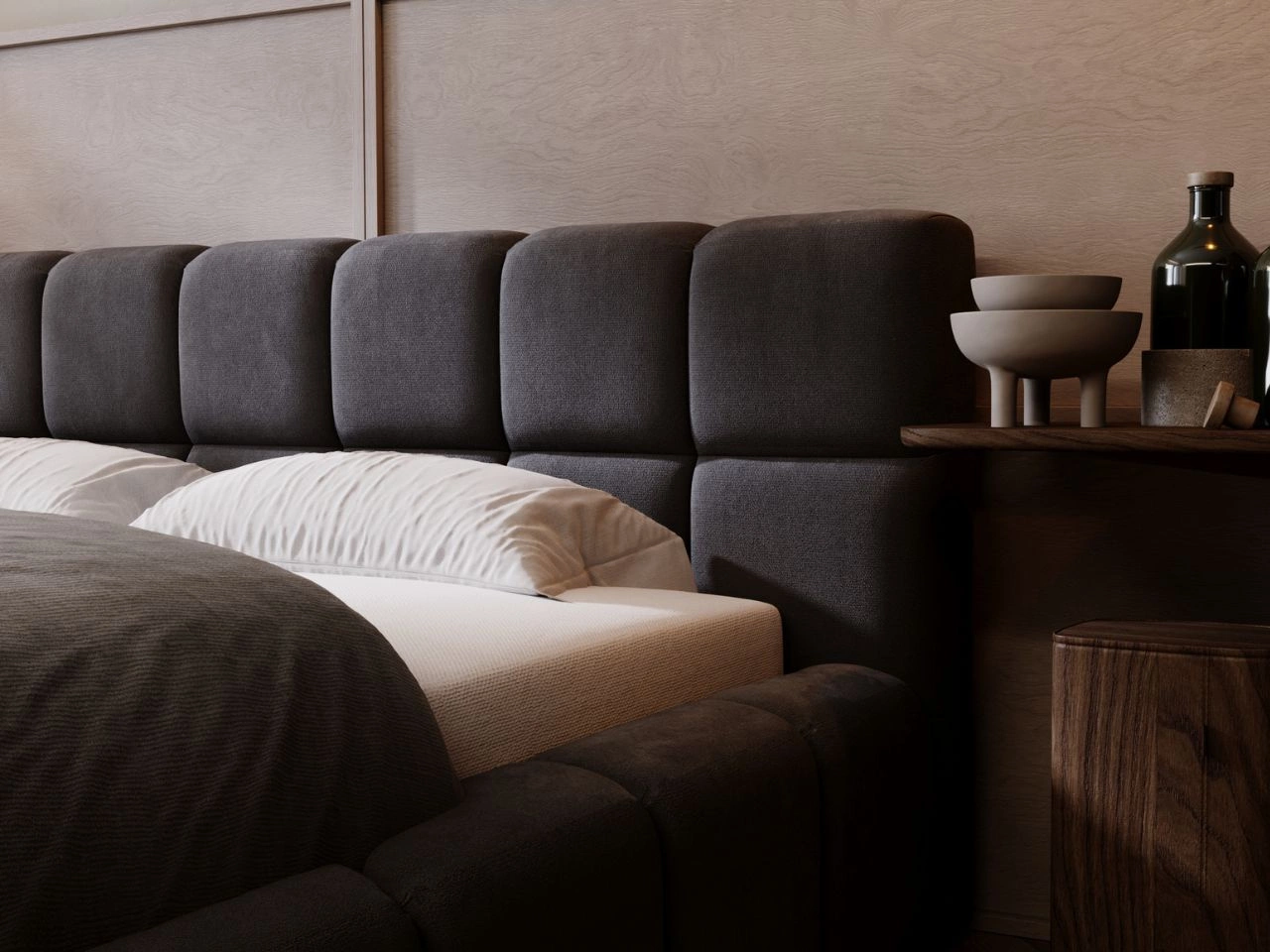 Eine Besonderheit dieses Möbels ist seine Konstruktion. Bei der Herstellung wurde ein dicker Schaumstoff verwendet, der den Bettrahmen perfekt ausfüllt und dem Möbel eine einzigartige Form verleiht. Die Seitenteile des Bettes sind so dick, dass man zum Beispiel sein Handy darauf ablegen kann. Das weiche und schön gesteppte Kopfteil ist ein funktionelles Designelement des Bettes, da es beim Lesen oder Fernsehen eine hervorragende Rückenlehne bietet. Darüber hinaus hat das Bett mit Lattenrost 180x200 Alicante dekorative Quadrate am Kopfteil, die sehr elegant und stilvoll wirken. Das originelle Design des Schlafzimmerbett 180x200 Alicante harmoniert perfekt mit einer luxuriösen und eleganten Inneneinrichtung.
