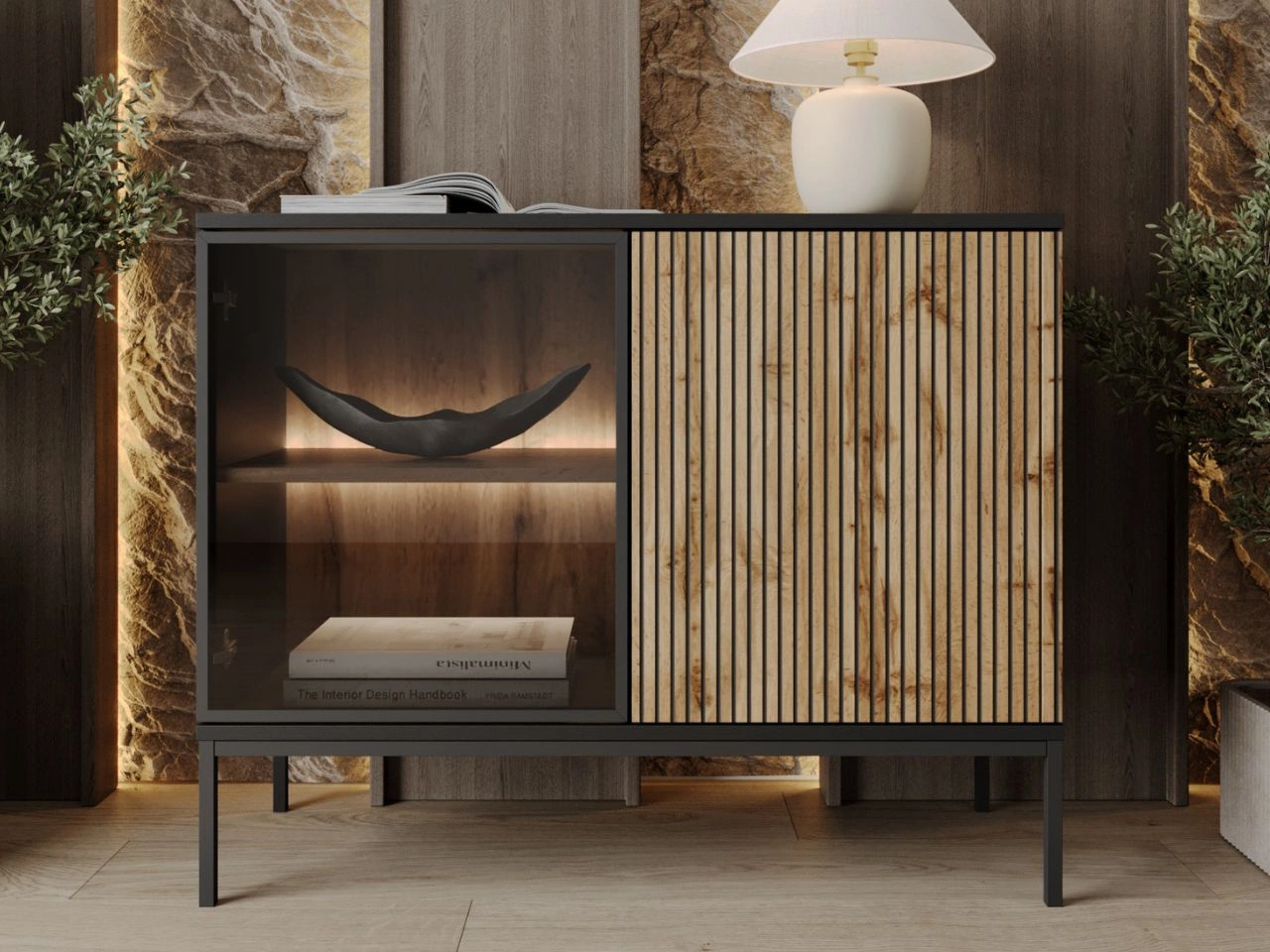 Kommode LED Deo - ein elegantes Möbelstück mit einzigartigem Loft-Stil und praktischem Design. Sie hat 2 zu öffnende Fronten, von denen eine aus Glas ist, was ihren Charme noch verstärkt. Hochwertige Materialien sorgen für die Langlebigkeit des Möbels, das mit Sicherheit viele Jahre halten wird.