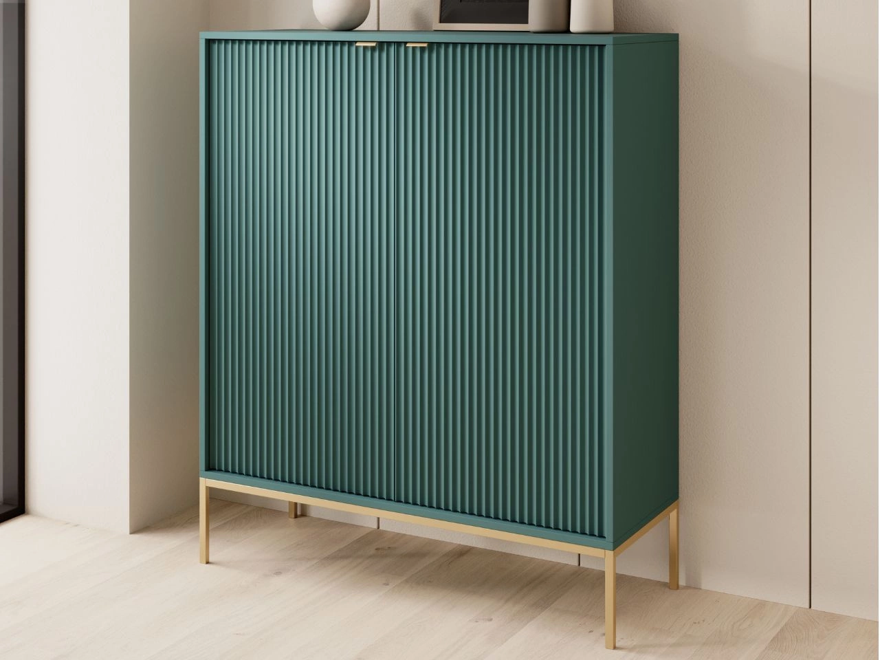 Hohe Kommode Amber ist die perfekte Lösung für jeden, der stilvolle und zugleich praktische Möbel in seinem Zuhause haben möchte. Dieses interessante Möbelstück zeichnet sich durch gerillte Fronten und metallische Beine aus, die aufgrund ihrer Höhe der Silhouette Leichtigkeit verleihen und sie optisch sehr geschickt machen. Zwei Paare von Türen mit goldenen metallischen Griffen verbergen eine praktische Anordnung von sechs Regalen, die es ermöglichen, unsere Kleidung ordentlich zu organisieren. Um die Haltbarkeit des Möbels zu erhöhen, wurden die Kanten an den neuralgischen Stellen mit ABS-Kante beschichtet, die vor kleinen mechanischen Schäden schützt.Die Kommode Amber eignet sich perfekt für das Wohnzimmer, das Schlafzimmer oder den Flur.