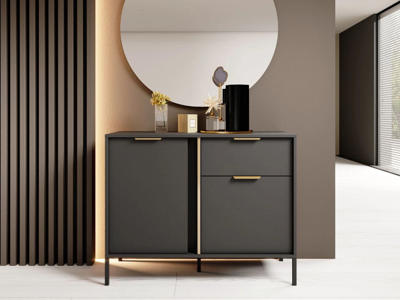 Kommode verfügt über eine geräumige Schublade mit Vollauszug und zwei Schränke mit je einem Einlegeboden im Inneren. Die großzügige Fläche bietet viel Platz für die Präsentation von Büchern oder Familienfotos. Sein ästhetisches Erscheinungsbild wird durch dekorative goldfarbene ABS-Kanten unterstrichen, die dem Möbel Eleganz und einen einzigartigen Charakter verleihen. Metallgriffe in der gleichen Farbe verleihen der Kommode ein modernes und luxuriöses Aussehen.