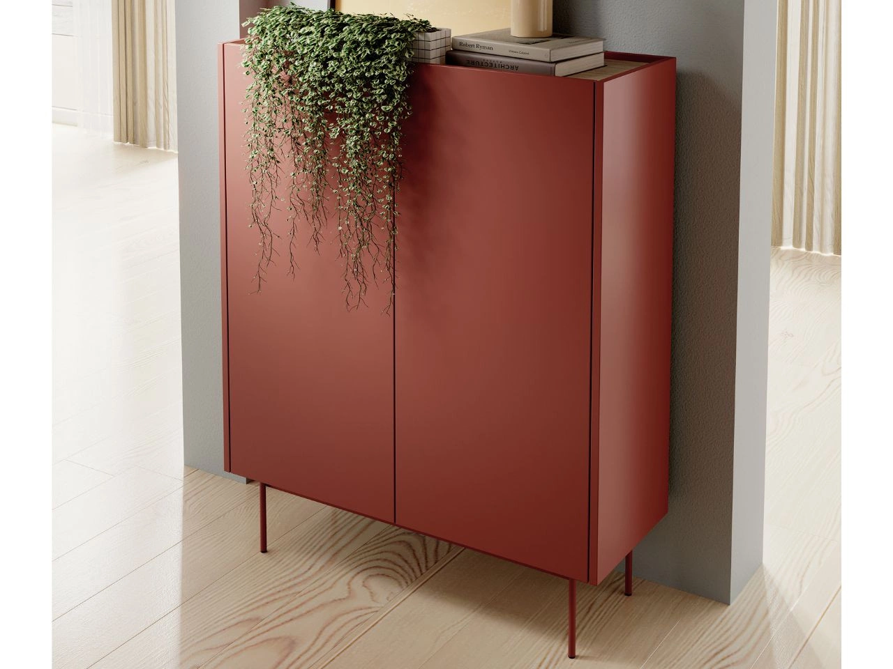 Kommode beeindruckt mit ihrer schlichten, geometrischen Form und leicht abgerundeten Kanten, die ihr eine subtile Eleganz verleihen. Die hohen, schlanken Beine entlasten optisch die Konstruktion und sorgen für Leichtigkeit. Die glatten, einheitlichen Fronten in einem warmen Rotton der Erde harmonieren perfekt mit der feinen Deckplatte in natürlichem Eichenholz-Farbton (wahrscheinlich Sonoma) und schaffen so einen ausgewogenen Kontrast.