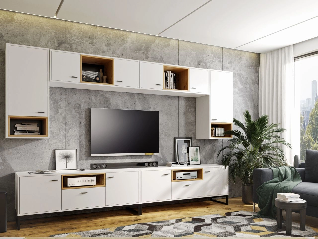 Möbelkollektion Geneva bietet eine breite Auswahl an Einrichtungsgegenständen für Wohnzimmer, Jugendzimmer und sogar den Flur. Jedes Möbelstück wurde mit höchster Sorgfalt und Liebe zum Detail hergestellt, um eine lange Lebensdauer zu gewährleisten. Zur Herstellung Möbel wurde eine 16 Millimeter dicke laminierte Platte verwendet, die zusätzlich mit ABS-Kantenband versehen ist, um vor kleinen mechanischen Beschädigungen zu schützen. Ein charakteristisches Merkmal Geneva-Serie sind die Metallgestelle, auf denen Möbel platziert sind. Die Elemente der Kollektion können beliebig kombiniert werden, um individuelle Kompositionen zu schaffen, die den Bedürfnissen und Vorlieben der Benutzer entsprechen.