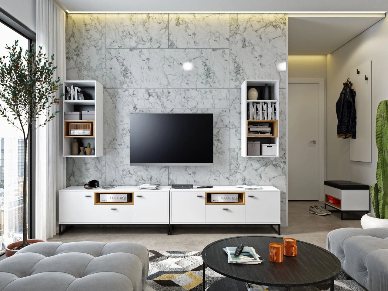 Geneva-Möbelkollektion bietet eine vielfältige Auswahl an Möbelstücken, die sowohl für das Wohnzimmer als auch für das Jugendzimmer oder den Flur geeignet sind. Jedes Stück wurde sorgfältig und detailreich gefertigt. Um eine angemessene Haltbarkeit zu gewährleisten, wurde bei der Herstellung der Möbel eine 16 Millimeter dicke laminierte Platte verwendet, die zusätzlich an den Kanten mit ABS-Kante versehen ist, um vor kleinen mechanischen Beschädigungen zu schützen. Ein charakteristisches Merkmal Geneva-Serie sind die Metallgestelle, auf denen die Möbel platziert sind. Die Elemente der Kollektion können beliebig miteinander kombiniert werden, um individuelle Kompositionen zu schaffen, die den Bedürfnissen und Vorlieben der Benutzer entsprechen.