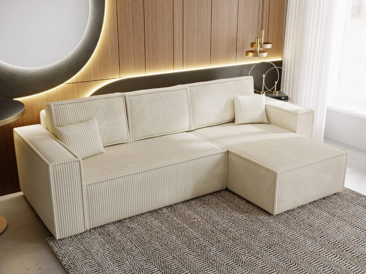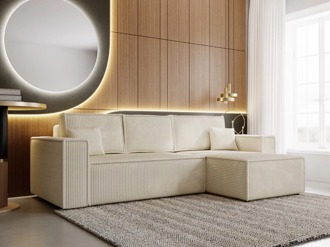 Ecksofa Prato mit Schlaffunktion und Bettkasten ist eine hervorragende Wahl für kleine und mittelgroße Wohnzimmer, in denen jeder Quadratmeter zählt. Das Möbelstück verfügt über breite Armlehnen sowie abnehmbare Rückenpolster – drei große und zwei kleine. Die Kissenbezüge sind abnehmbar, was die Reinigung deutlich erleichtert.