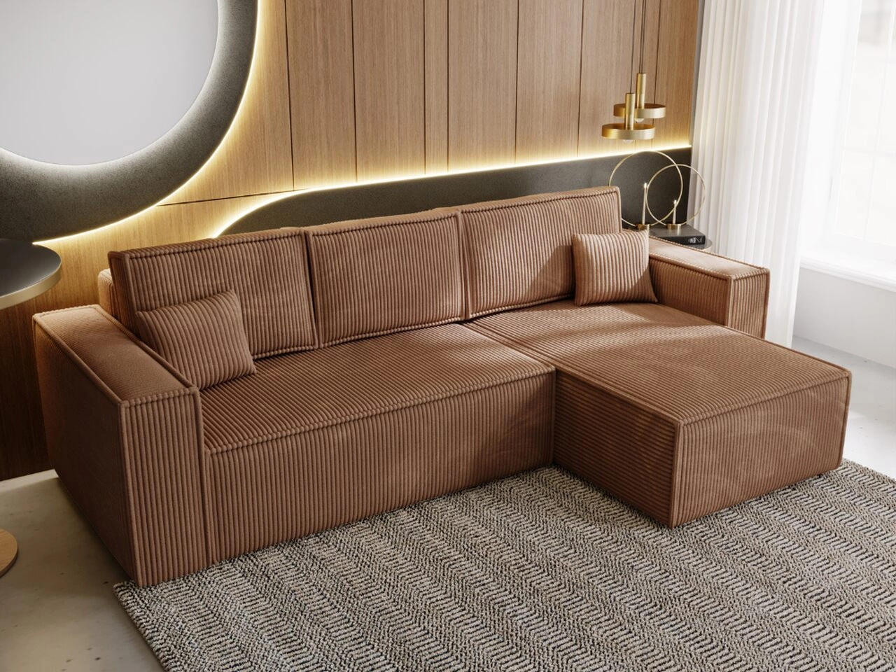 Top ist ein moderner Cord-Polsterstoff mit markanter Rippenstruktur und einer weichen, angenehmen Haptik. Die dichte Webart und die kräftige Struktur verleihen Möbeln einen eleganten und zugleich gemütlichen Charakter. Der Stoff ist strapazierfähig und weist eine Abriebfestigkeit von etwa 25.000 Martindale-Zyklen auf, wodurch er sich gut für den täglichen Gebrauch eignet. Top Cord behält seine intensiven Farben und bleicht nicht unter Lichteinfluss aus, was ihn zur idealen Wahl für moderne, vom Retro- oder Boho-Stil inspirierte Innenräume macht.