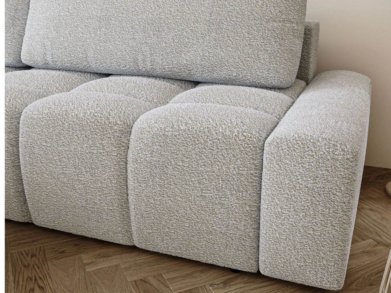 Coral-Stoff ist ein moderner Möbelstoff, ein subtiler Bouclé-Stoff, der sich durch eine weiche und flauschige Oberfläche auszeichnet. Die Struktur dieses Stoffes ist etwas unregelmäßig und ähnelt der Oberfläche von Schafwolle, wobei kleine Schlingen und Rüschen sichtbar sind. Er ist dicht gewebt und bildet eine gleichmäßige und kompakte Oberfläche, die sehr komfortabel und angenehm ist.