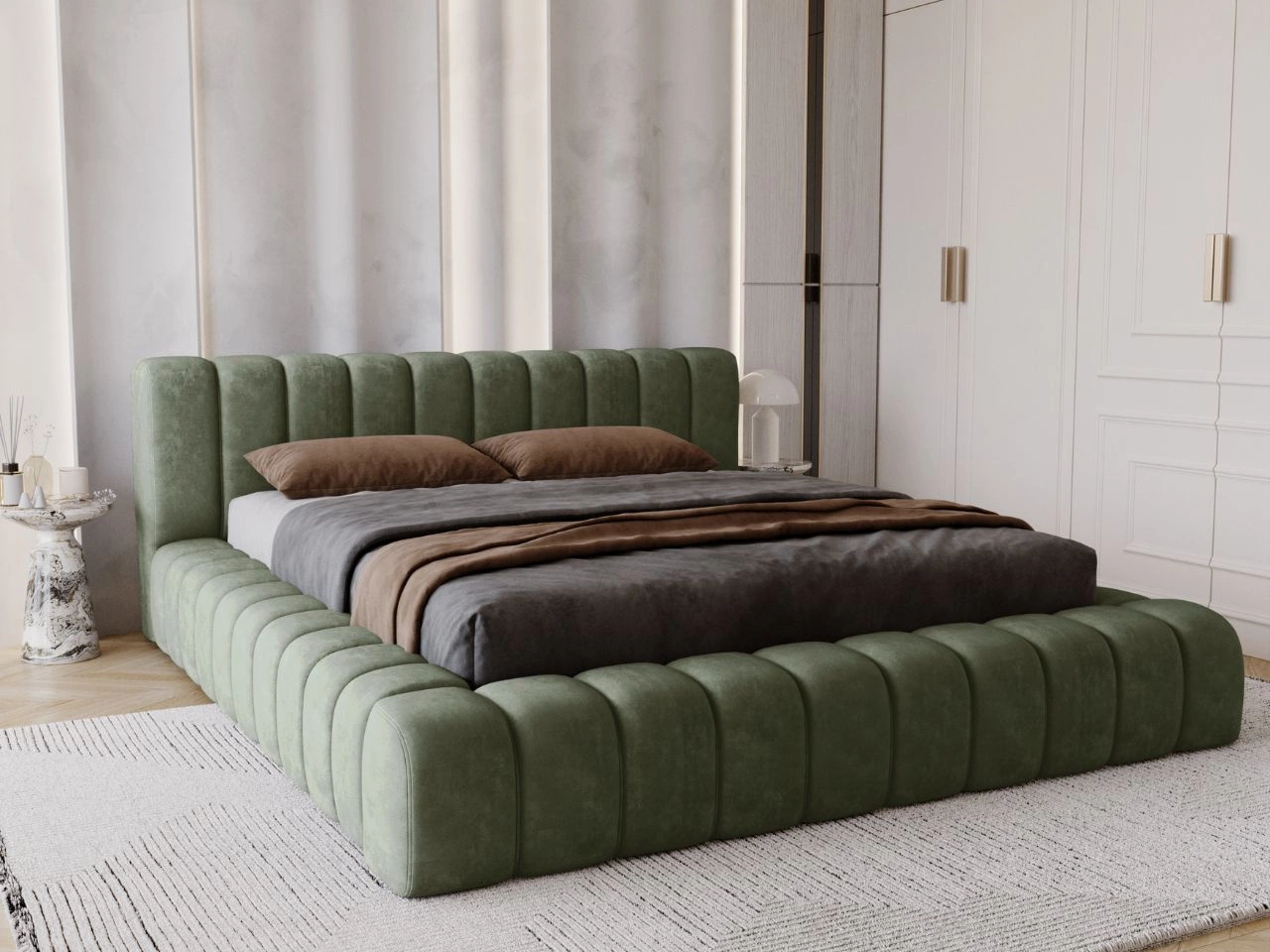 Das Polsterbett Italia ist eine interessante Wahl für alle, die modernes Design und hohen Komfort schätzen. Dieses Möbelstück besticht vor allem durch stilvolle vertikale Nähte und ein weiches, hohes Kopfteil. Letzteres erfüllt nicht nur eine dekorative Rolle, sondern hat auch einen praktischen Aspekt, da es ermöglicht, sich bequem anzulehnen, während man liest oder fern sieht. Sowohl der Bettrahmen als auch das Kopfteil sind mit dicker und weicher Polsterung ausgestattet, was eine gemütliche Atmosphäre im Schlafzimmer schafft.