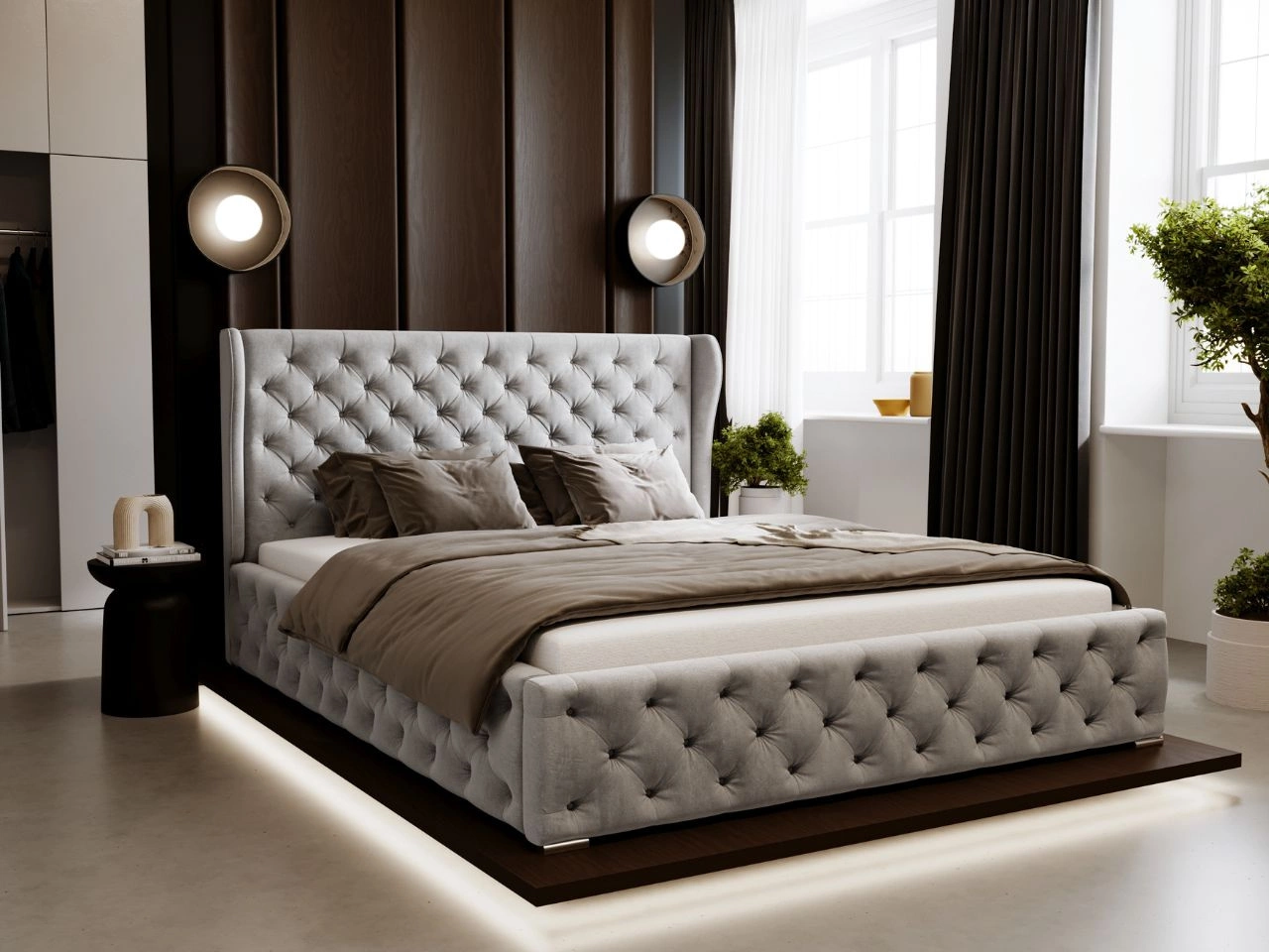 - Gepolstertes Bett mit gestepptem Kopfteil und Seiten