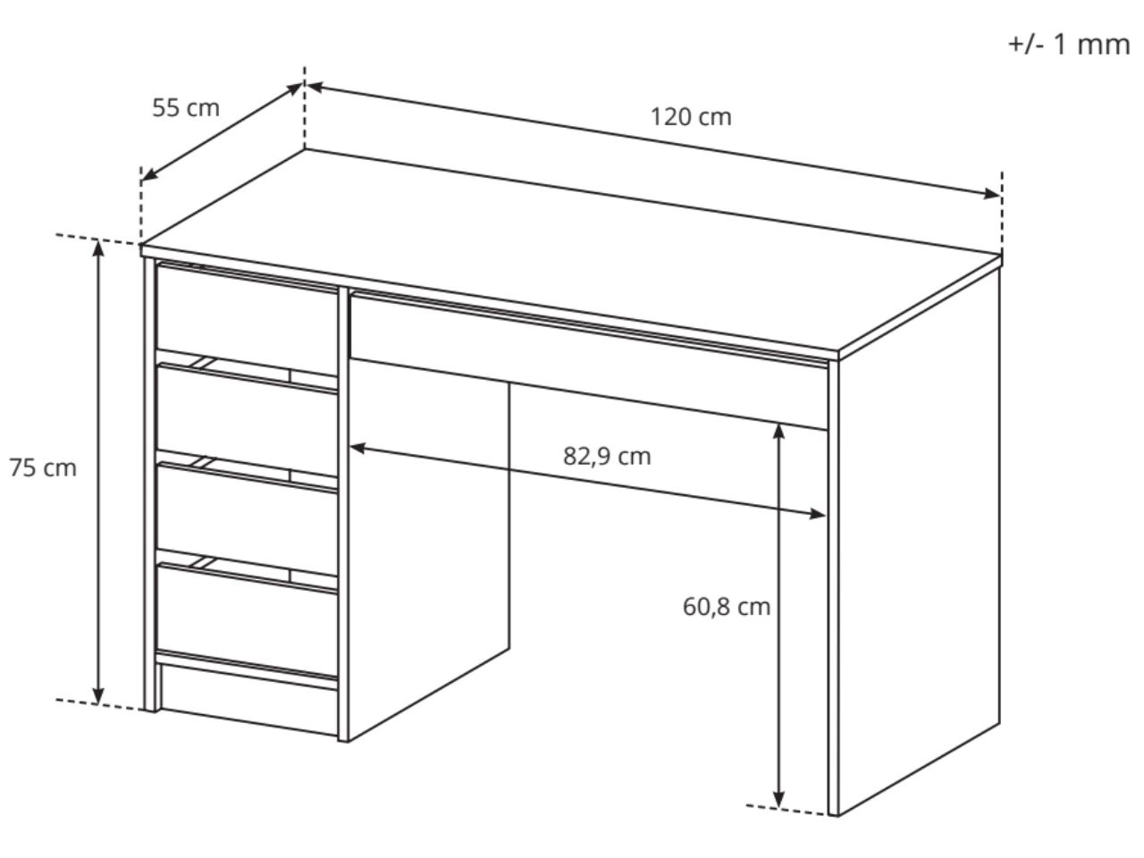 Modell ist mit praktischen Schubladen ausgestattet, die das Ordnen von Dokumenten, Büroaccessoires und kleinen Gegenständen erleichtern und einen aufgeräumten Arbeitsplatz unterstützen. Kanten des Möbels sind mit langlebiger ABS-Kantenumleimung versehen, was die Widerstandsfähigkeit erhöht und die Lebensdauer des Schreibtisches verlängert.