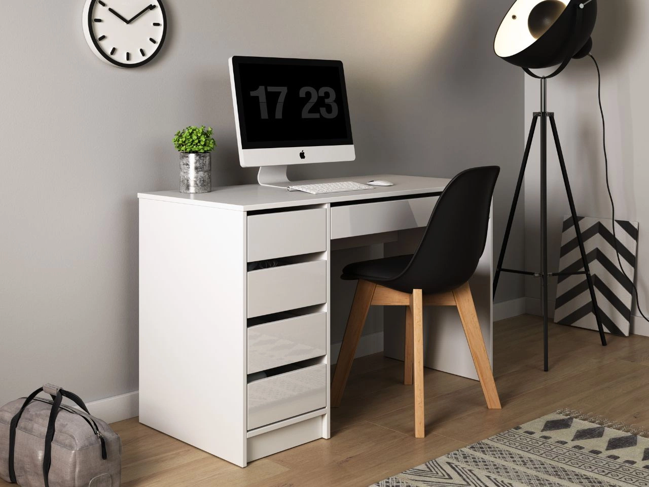 Schubladen sind auf Rollführungen montiert und ermöglichen ein leichtgängiges Öffnen und Schließen. Dank der Möglichkeit zur Montage der Schubladeneinheit links oder rechts lässt sich der Schreibtisch flexibel an die Raumaufteilung anpassen. Griffloses System unterstreicht den modernen Charakter und sorgt für eine klare, aufgeräumte Optik.