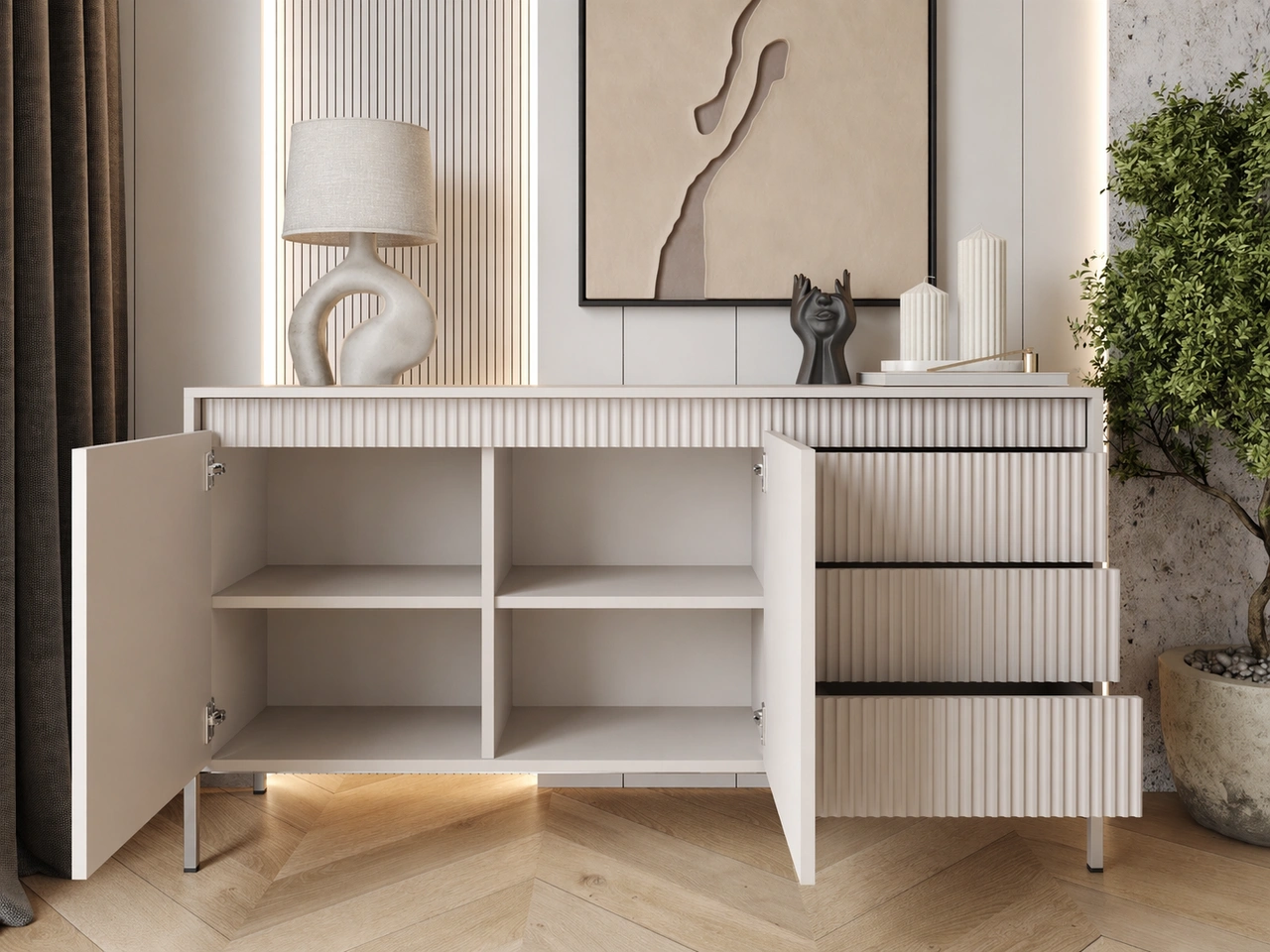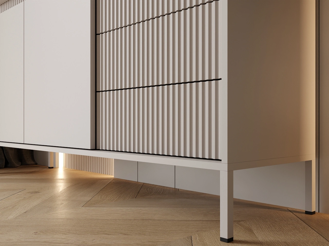 Möbelkollektion Sorano zeichnet sich durch ein modernes, minimalistisches Design aus, das perfekt zu den aktuellen Einrichtungstrends passt. Die Kombination aus Funktionalität und Ästhetik macht die Möbel ideal sowohl für skandinavische als auch für modernistische Interieurs. Die charakteristischen gerillten Fronten, die dezente Farbgebung und die Metallfüße verleihen der gesamten Kollektion eine außergewöhnliche Leichtigkeit und Eleganz.