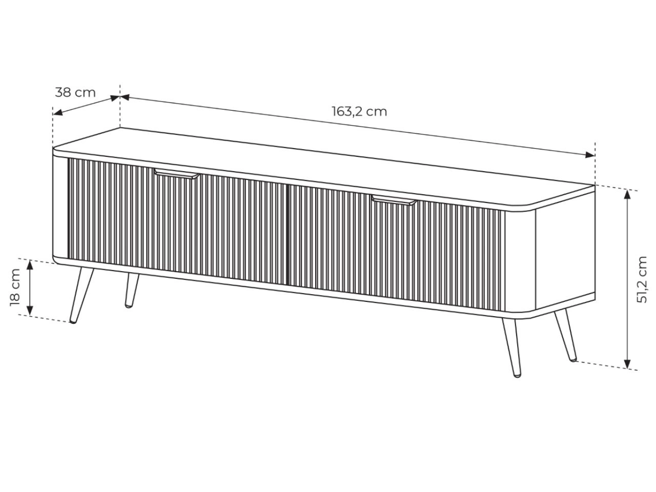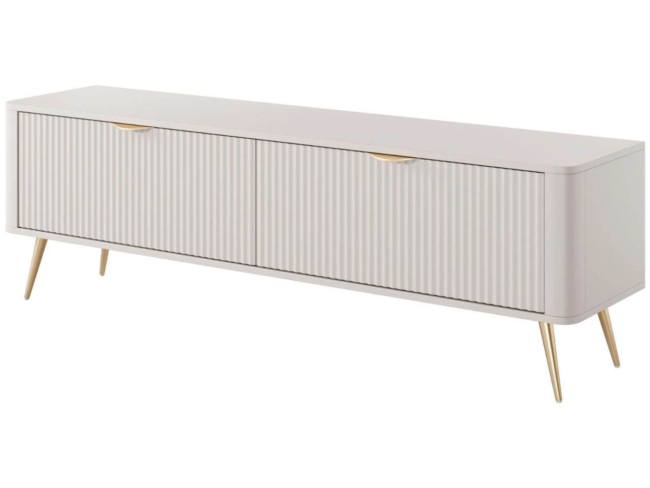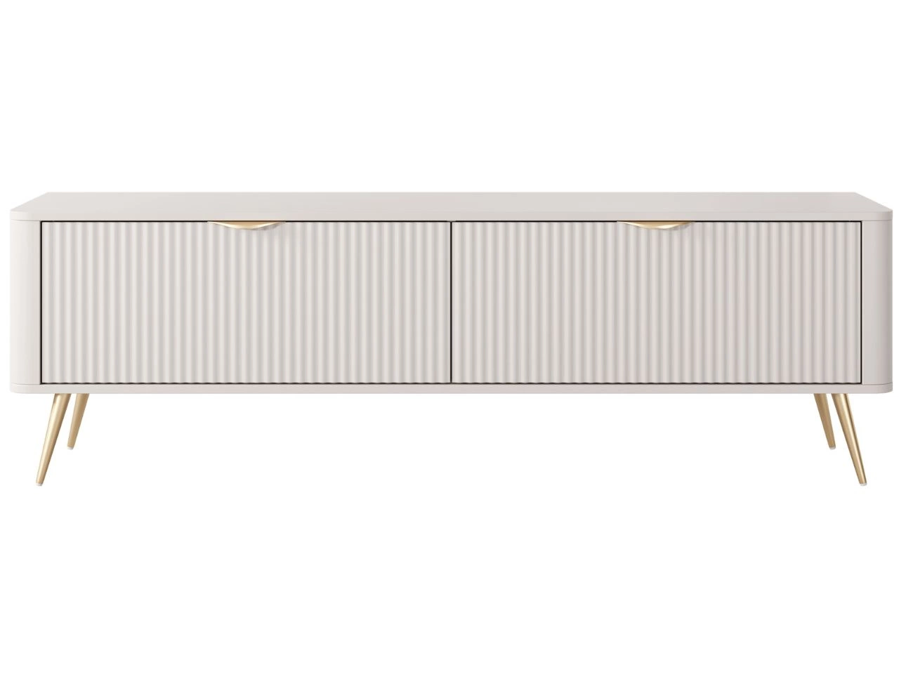 Latina RTV-Schrank vereint Funktionalität mit einem eleganten Design und verleiht dem Wohnzimmer einen modernen Akzent. Gefertigt aus hochwertigen Materialien, garantiert er Langlebigkeit und Widerstandsfähigkeit bei langfristigem Gebrauch. Der Korpus aus laminierter Spanplatte in einem sanften Beigeton harmoniert perfekt mit den MDF-Fronten, die durch ihre Rillenoptik einen originellen, modernen Charme ausstrahlen. Die abgerundeten MDF-Leisten an den Seiten ergänzen das stilvolle Erscheinungsbild des Schranks.
