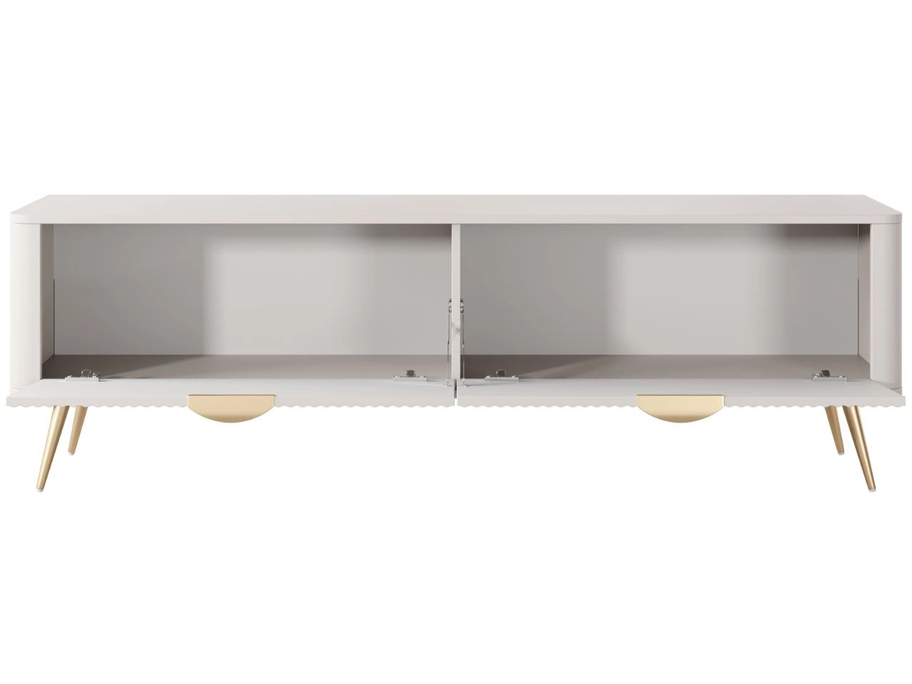 Großzügige Innenraum bietet viel Platz für die Aufbewahrung von Multimedia-Geräten und anderen Kleinigkeiten. Goldfarbene Metallgriffe und -füße verleihen dem Schrank zusätzlichen Luxus und Eleganz. Die stabilen Scharniere gewährleisten ein sanftes und leises Öffnen und Schließen der Türen und sorgen so für hohen Bedienkomfort und ein ansprechendes Gesamtbild.