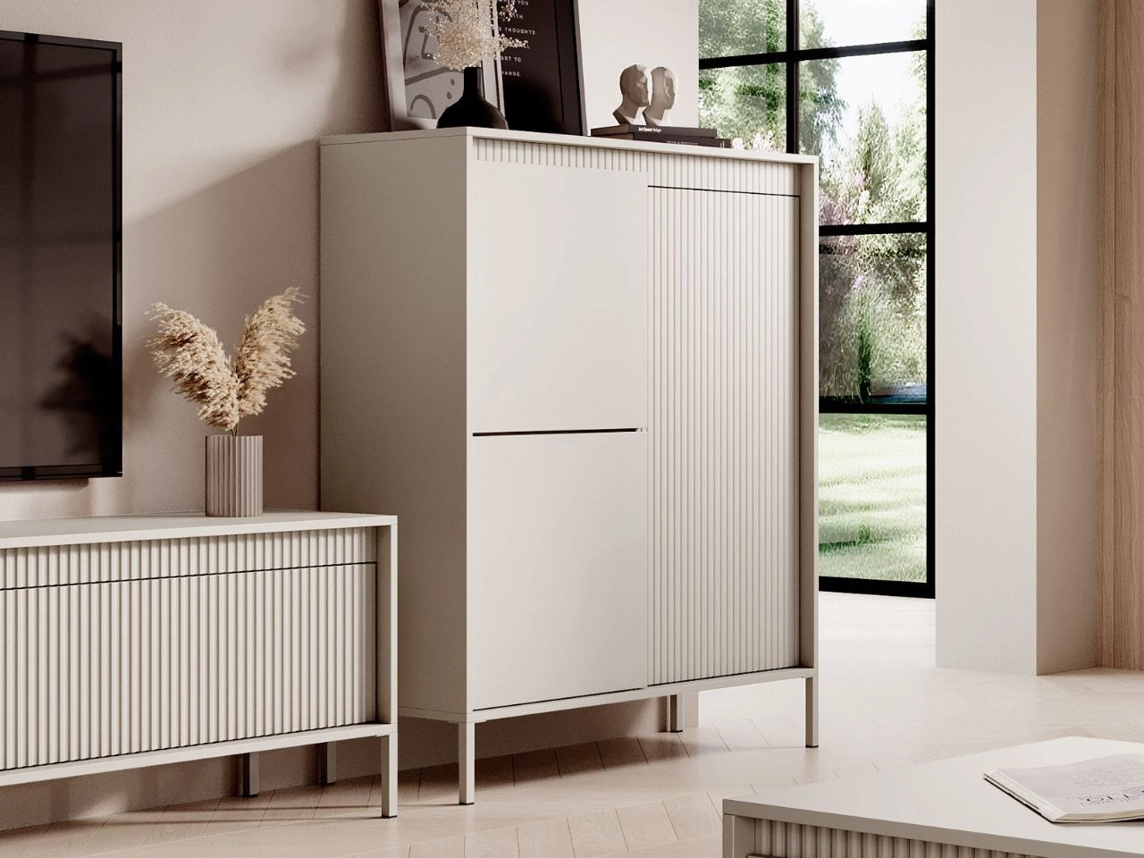 Möbelkollektion Sorano zeichnet sich durch ein modernes, minimalistisches Design aus, das perfekt zu den aktuellen Einrichtungstrends passt. Die Kombination aus Funktionalität und Ästhetik macht die Möbel ideal sowohl für skandinavische als auch für modernistische Interieurs. Die charakteristischen gerillten Fronten, die dezente Farbgebung und die Metallfüße verleihen der gesamten Kollektion eine außergewöhnliche Leichtigkeit und Eleganz.