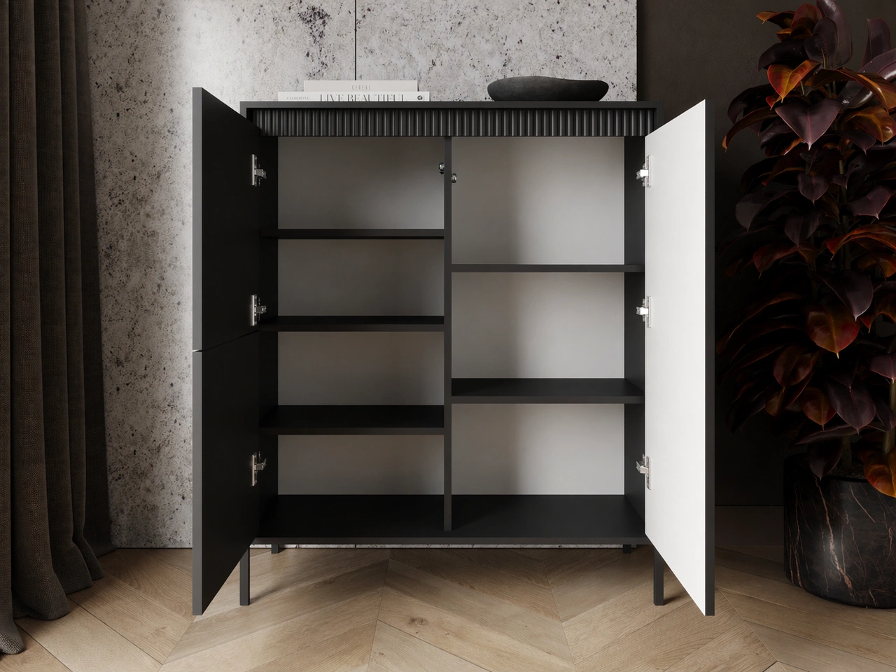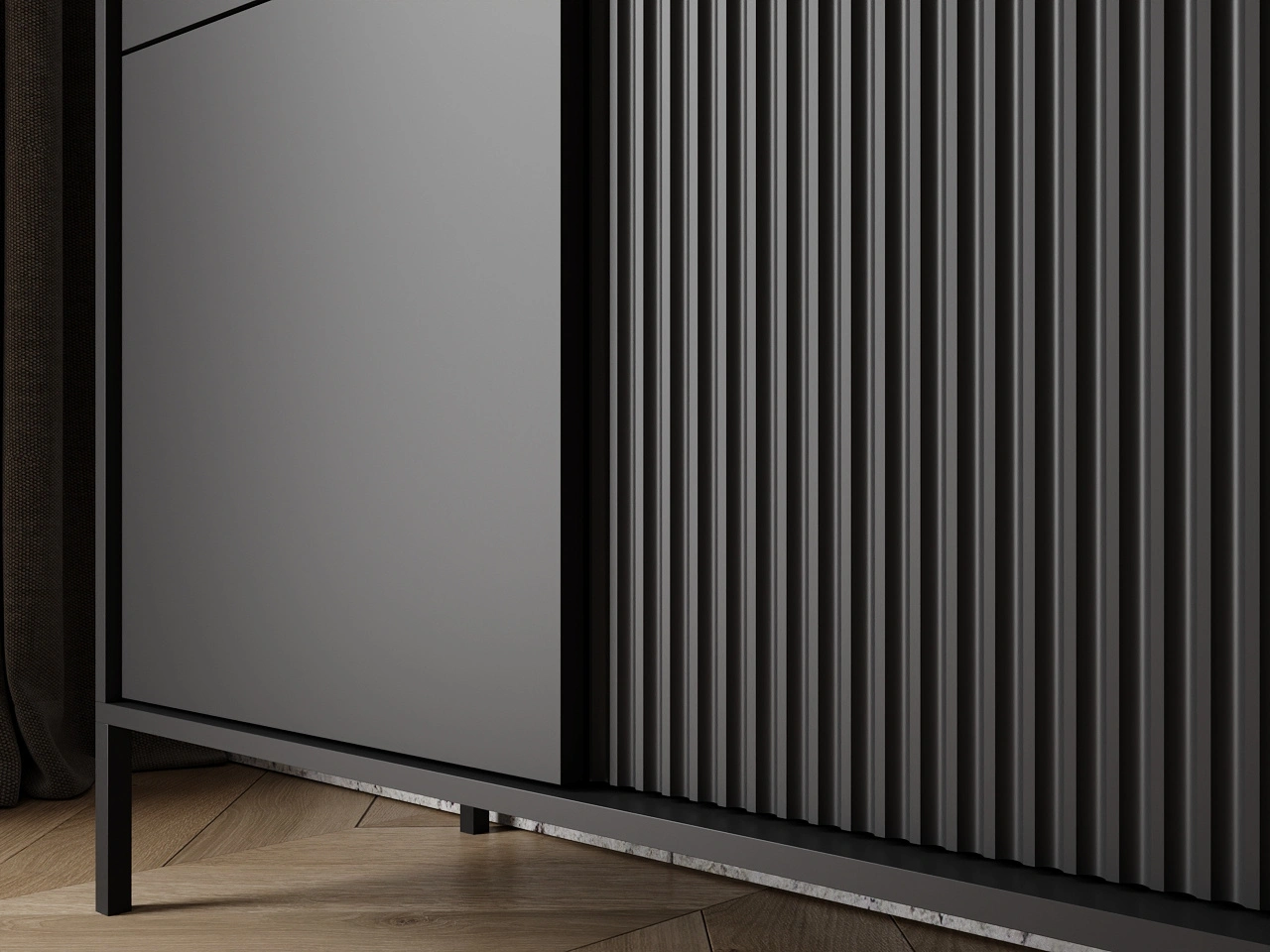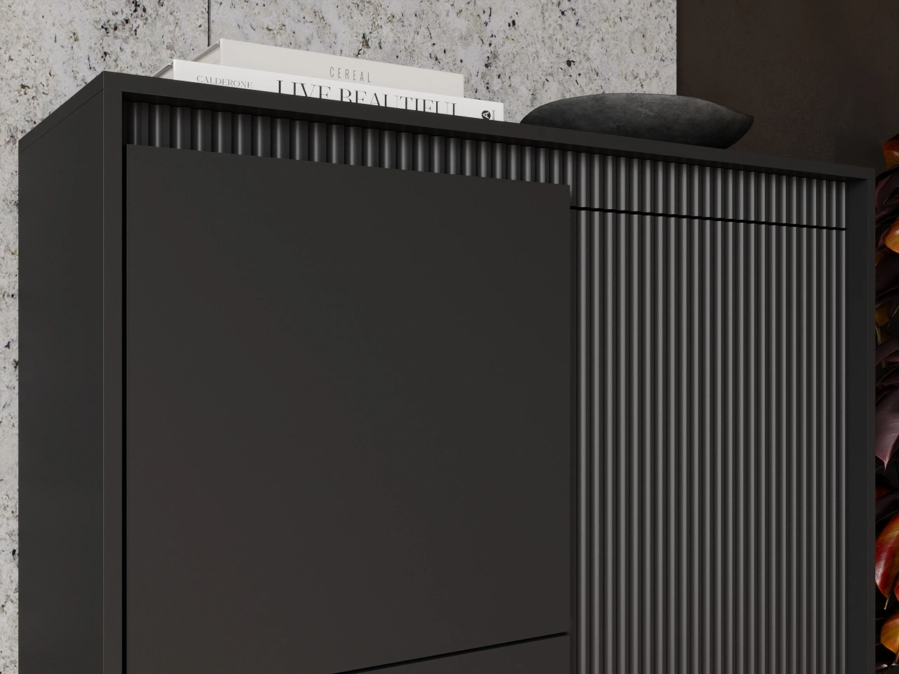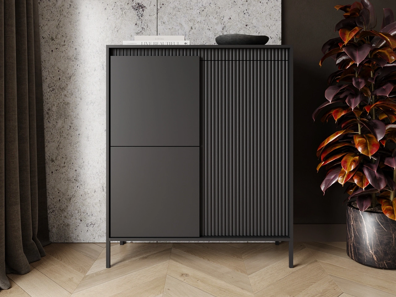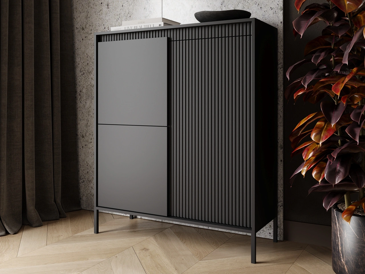 Möbelkollektion Sorano zeichnet sich durch ein modernes, minimalistisches Design aus, das perfekt zu den aktuellen Einrichtungstrends passt. Die Kombination aus Funktionalität und Ästhetik macht die Möbel ideal sowohl für skandinavische als auch für modernistische Interieurs. Die charakteristischen gerillten Fronten, die dezente Farbgebung und die Metallfüße verleihen der gesamten Kollektion eine außergewöhnliche Leichtigkeit und Eleganz.