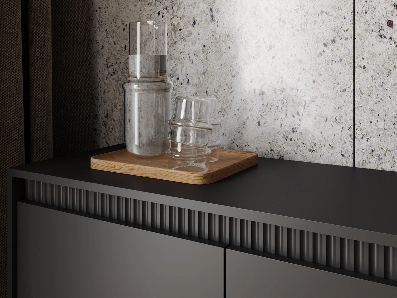 Möbelkollektion Sorano zeichnet sich durch ein modernes, minimalistisches Design aus, das perfekt zu den aktuellen Einrichtungstrends passt. Die Kombination aus Funktionalität und Ästhetik macht die Möbel ideal sowohl für skandinavische als auch für modernistische Interieurs. Die charakteristischen gerillten Fronten, die dezente Farbgebung und die Metallfüße verleihen der gesamten Kollektion eine außergewöhnliche Leichtigkeit und Eleganz.
