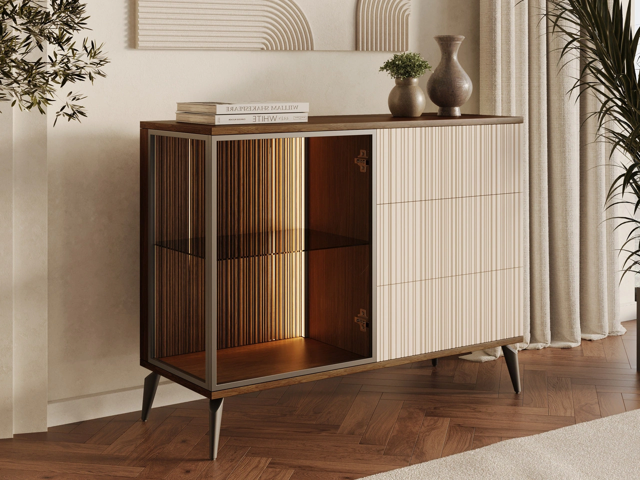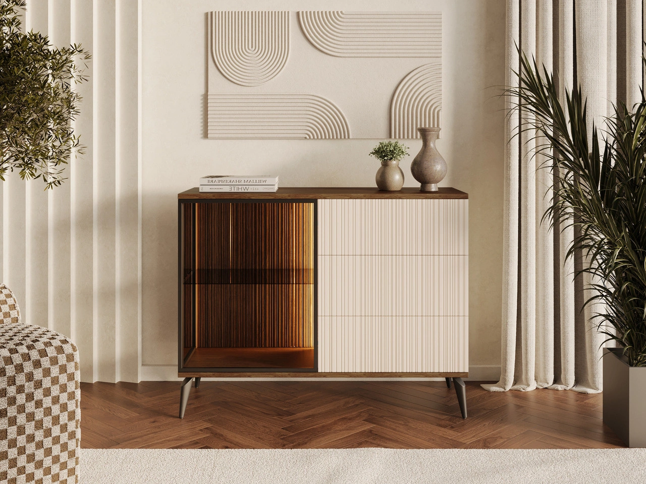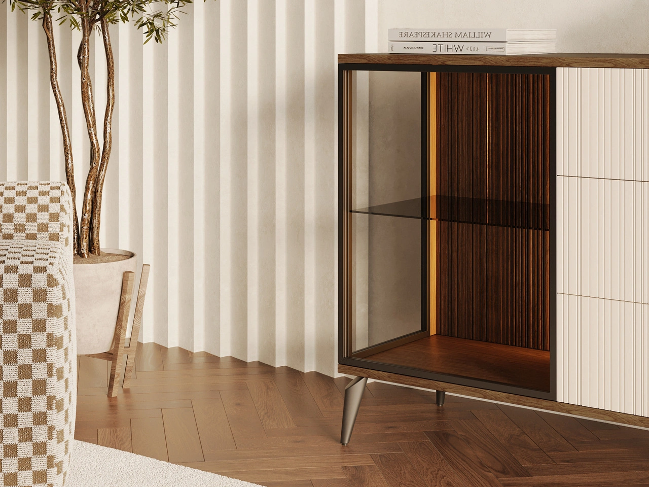 Innenraum Kommode wurde im Hinblick auf eine praktische Raumorganisation gestaltet. Er verfügt über einen geräumigen Schrank mit einer Glasablage und drei geräumigen Schubladen, die für viel Stauraum sorgen. Das Push-to-Open-system ermöglicht einen bequemen und intuitiven Zugriff auf die gelagerten Gegenstände. Verglaste Türen mit gerilltem Hintergrund ermöglichen eine elegante Präsentation von Dekorationen oder Lieblingskollektionen, integrierte LED-Beleuchtung hebt diese Details hervor und bringt stimmungsvolles Licht in den Raum.