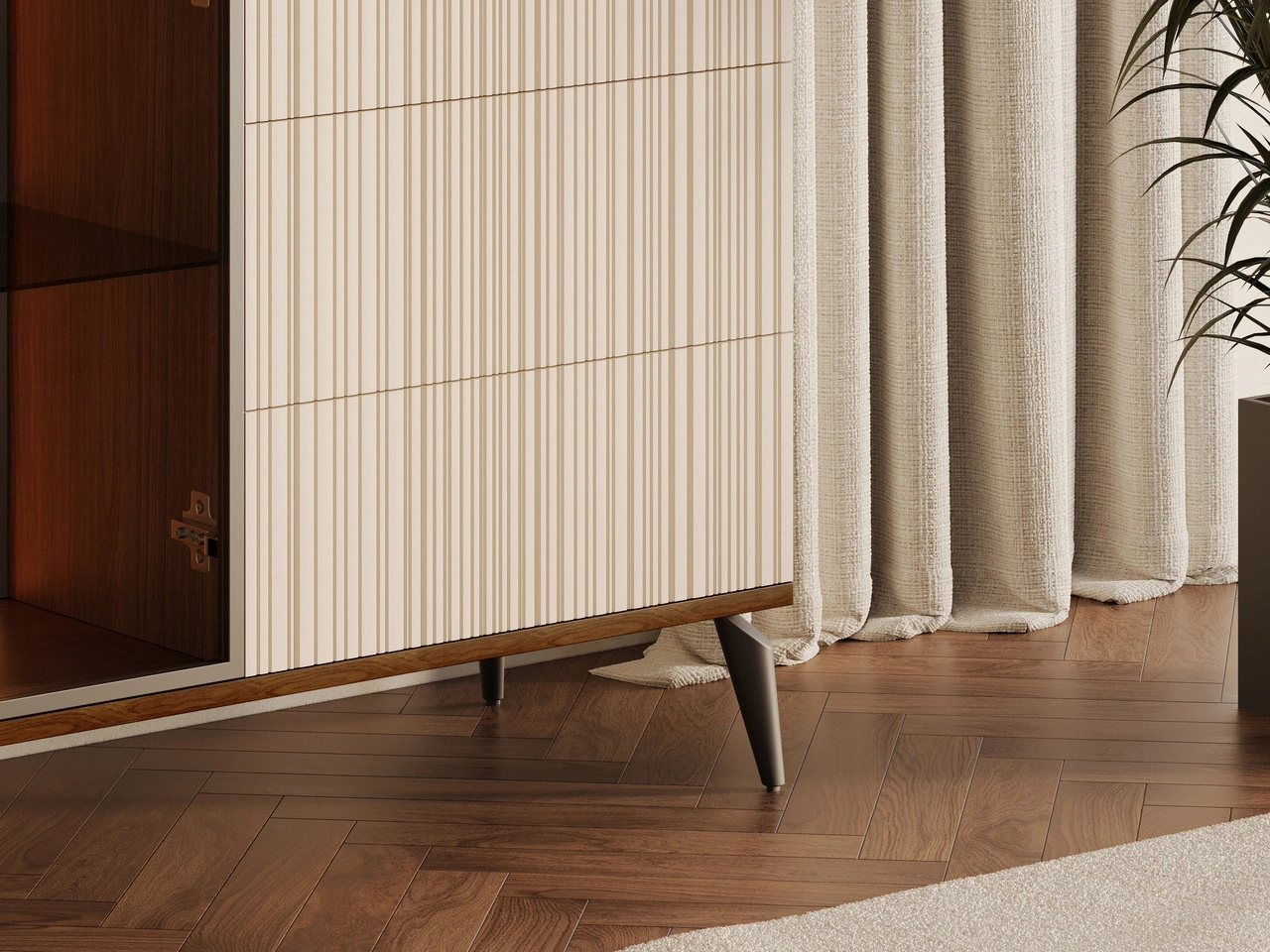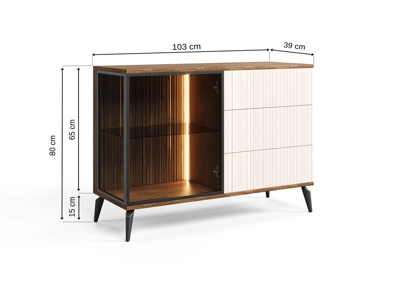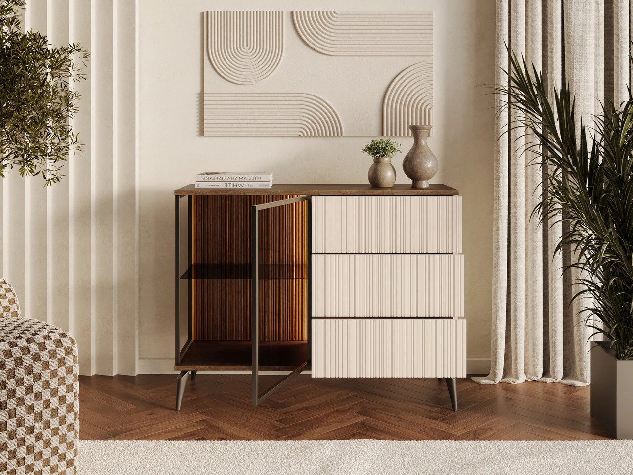 Innenraum Kommode wurde im Hinblick auf eine praktische Raumorganisation gestaltet. Er verfügt über einen geräumigen Schrank mit einer Glasablage und drei geräumigen Schubladen, die für viel Stauraum sorgen. Das Push-to-Open-system ermöglicht einen bequemen und intuitiven Zugriff auf die gelagerten Gegenstände. Verglaste Türen mit gerilltem Hintergrund ermöglichen eine elegante Präsentation von Dekorationen oder Lieblingskollektionen, integrierte LED-Beleuchtung hebt diese Details hervor und bringt stimmungsvolles Licht in den Raum.
