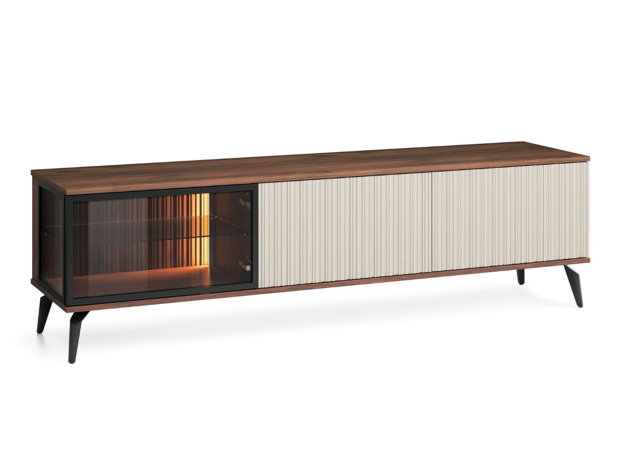 Ein charakteristisches Element Schranks ist eine gestreifte Front in einem eleganten Kaschmirton und Glas, die ihm ein einzigartiges Aussehen verleihen und seinen modernen Charakter unterstreichen. Die Struktur aus dunklem Walnussholz sorgt für Subtilität und das Ganze wird durch Metallbeine ergänzt, die für Stabilität, Leichtigkeit und optische Harmonie sorgen.