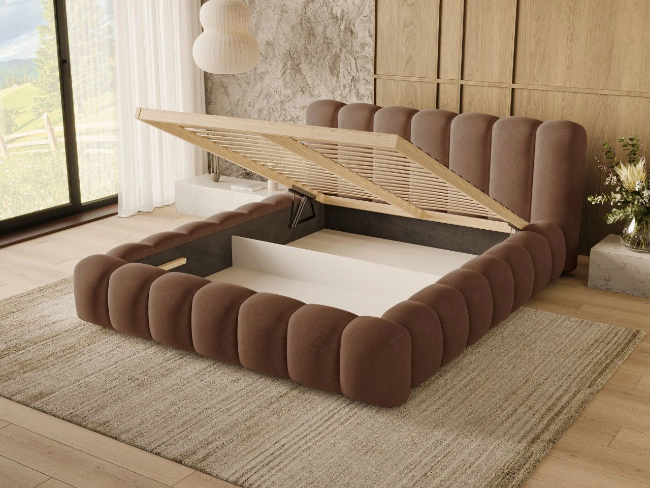 Modell Averia wurde mit Blick auf Komfort und Funktionalität entworfen. Ausgestattet mit einem geräumigen Bettkasten und einem stabilen Holzrahmen mit automatischem Hebemechanismus bietet es die ideale Lösung für Personen, die Wert auf Ordnung und Bequemlichkeit legen.