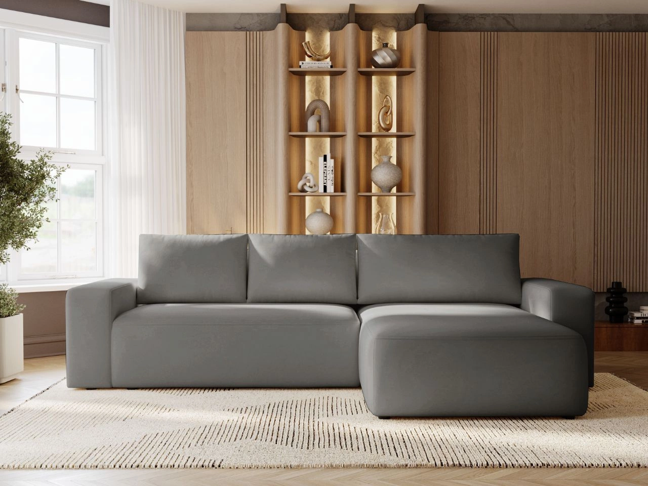 Das Ecksofa verfügt über eine Schlaffunktion, mit der es sich mühelos in eine bequeme Ruhefläche verwandeln lässt. Zusätzlich ist es mit einem praktischen Bettkasten ausgestattet, der die Aufbewahrung erleichtert und hilft, Ordnung im Wohnzimmer zu halten.