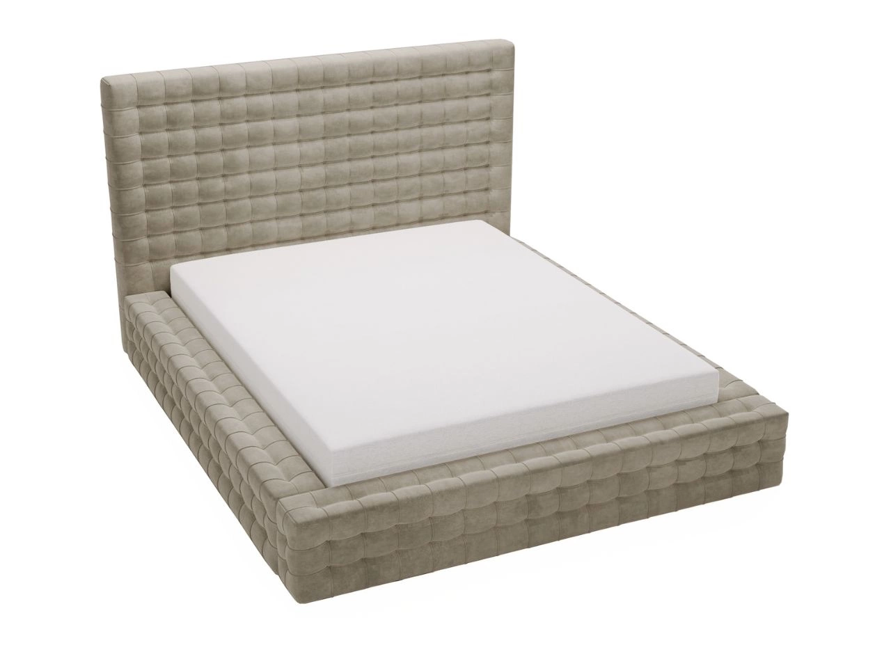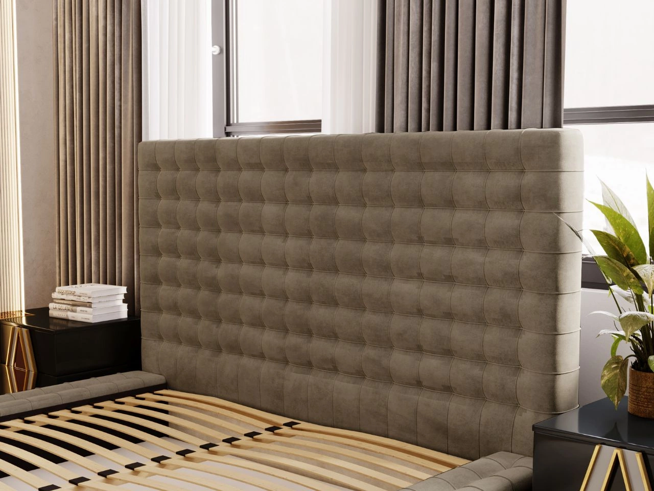 Das Bett zeichnet sich durch eine außergewöhnliche Polsterstruktur aus, die mit einer eleganten Steppung in Form eines geometrischen Karomusters verziert ist. Jedes quadratische Steppmodul wurde präzise gestaltet und bildet ein harmonisches Muster, das dem Bett einen luxuriösen Charakter verleiht. Der Bettrahmen ist bodennah gestaltet, was dem aktuellen minimalistischen Trend entspricht und gleichzeitig für Stabilität und eine moderne Optik sorgt.