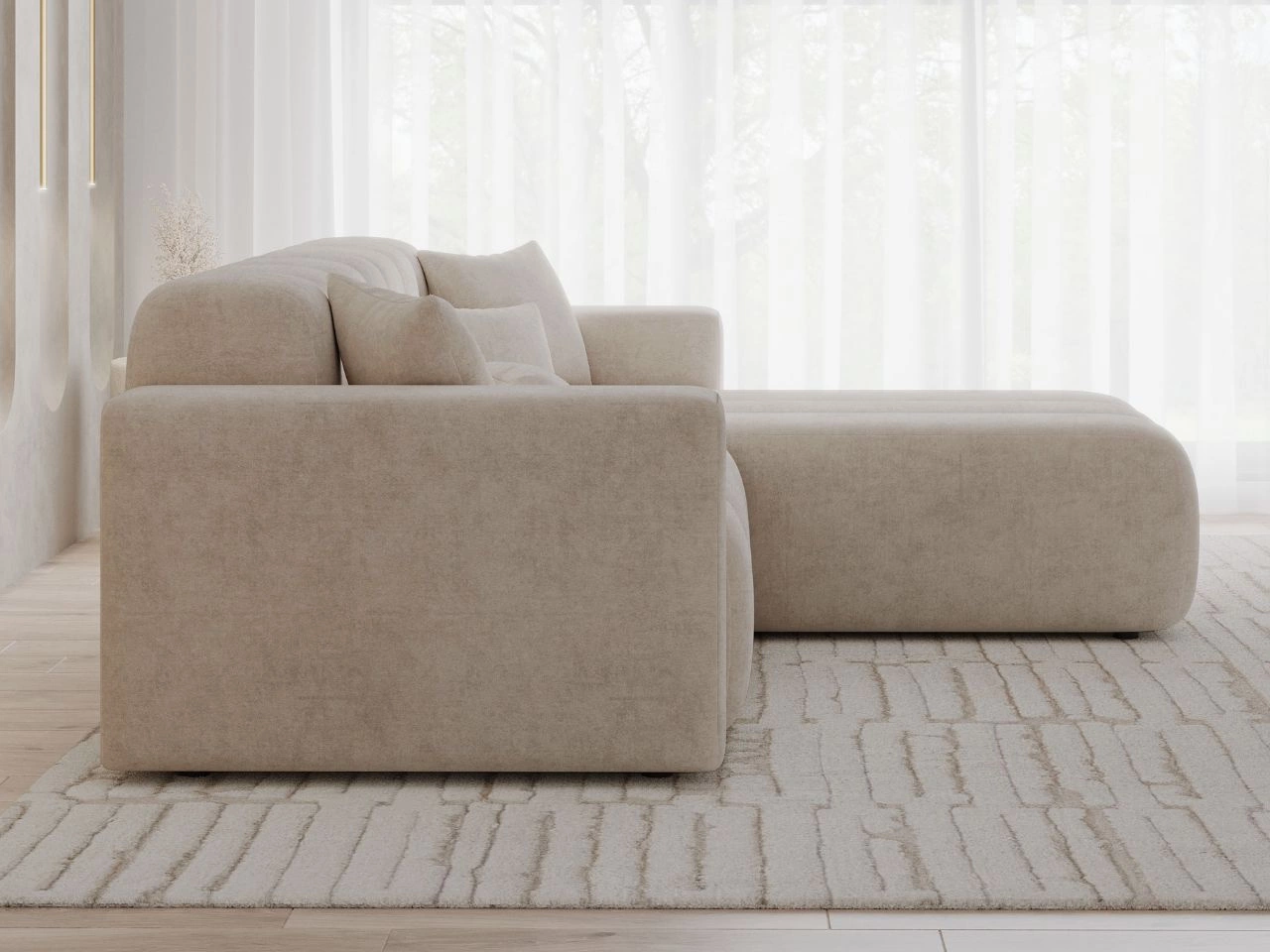 Durch die freistehende Konstruktion kann die Ecksofa Nork an jedem beliebigen Ort im Raum aufgestellt werden. Sie sieht sowohl von vorne als auch von hinten stilvoll aus und vereint Eleganz mit Funktionalität.