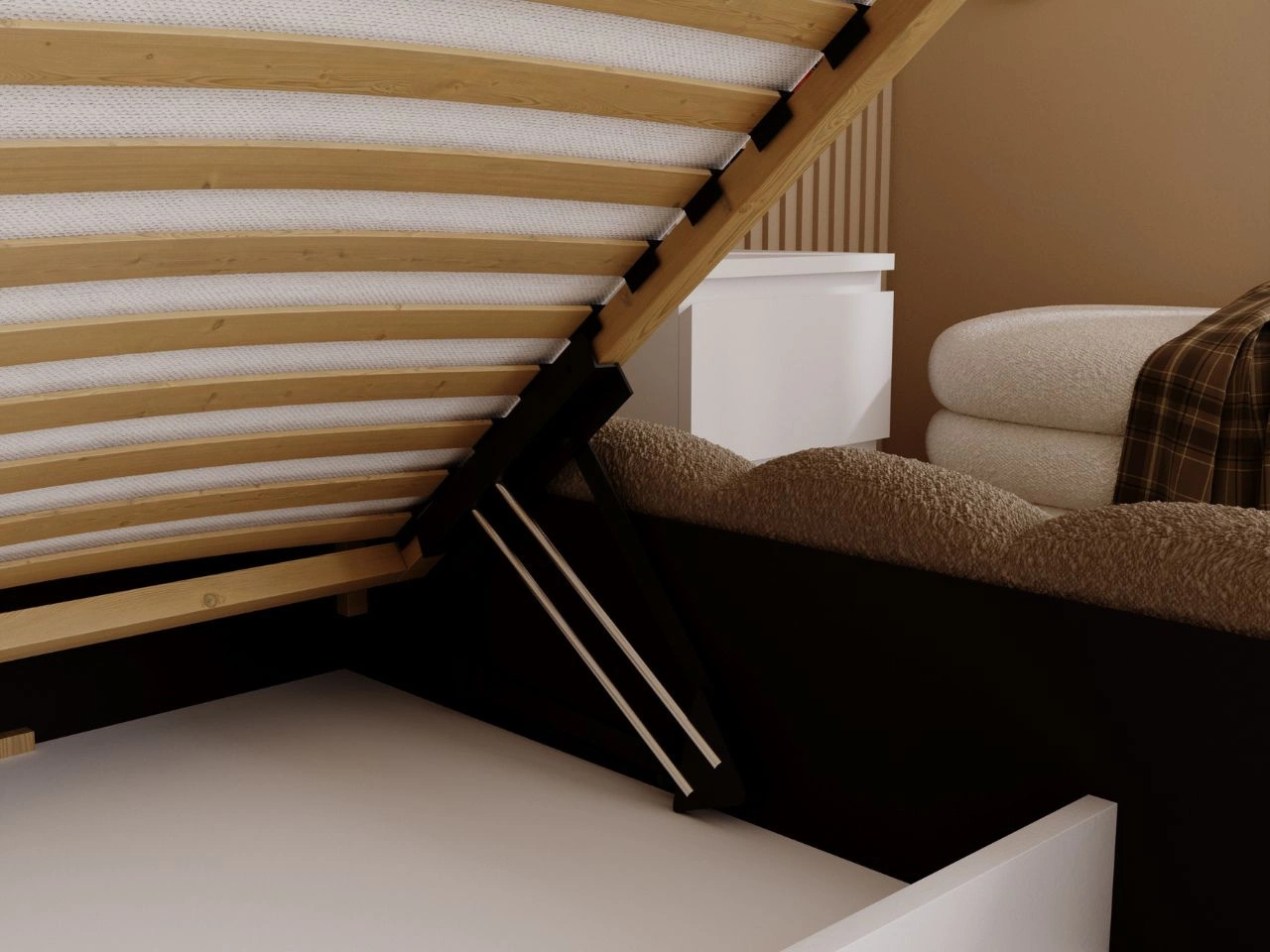 Das Doppelbett Smile ist zudem mit einem geräumigen Bettkasten für Bettwäsche ausgestattet, der sich unter dem im Set enthaltenen Holzlattenrost befindet (Matratze ist nicht im Lieferumfang enthalten). Um Zugang zum Bettkasten zu erhalten, muss der Lattenrost einfach von vorne nach oben gehoben werden. Der gesamte Vorgang ist dank der integrierten Hebemechanismen besonders einfach und komfortabel. Der Bettrahmen besteht aus einer Kombination von Massivholz und hochwertiger Möbelplatte, was für Stabilität sorgt und eine langjährige, problemlose Nutzung garantiert.