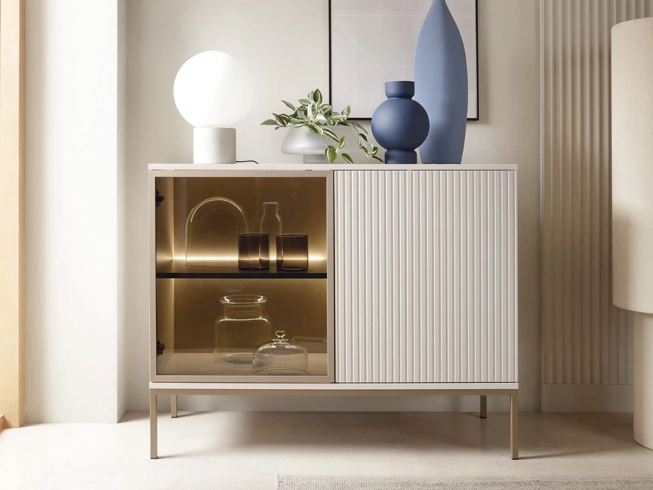 Vitrine Deo verfügt über eine Glasfront, die ihr Eleganz verleiht und eine wirkungsvolle Präsentation von Dekorationen ermöglicht. Ausgestattet mit einer Schublade, zwei zu öffnenden Fronten und zahlreichen Einlegeböden bietet es eine funktionale Aufbewahrungslösung.