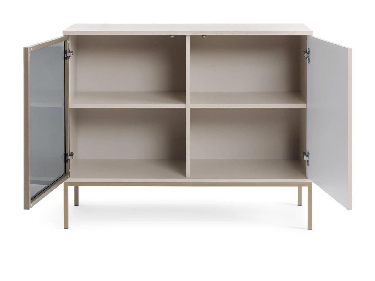 Kommode Deo ist ein stilvolles Möbelstück im Loft-Stil mit zwei zu öffnenden Fronten, von denen eine aus Glas besteht, was ihre Eleganz zusätzlich unterstreicht.