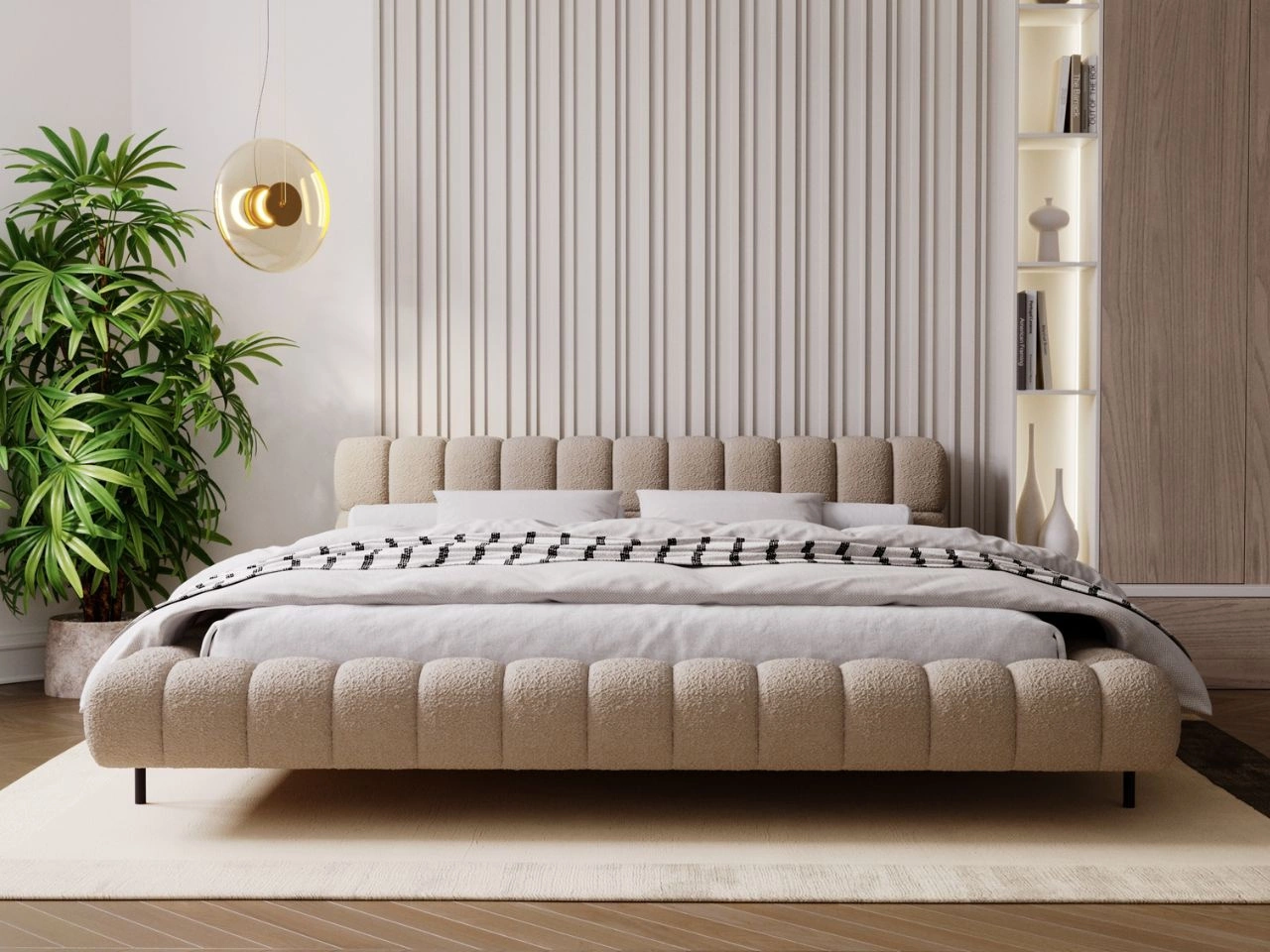 Polsterbett Imagine ist eine äußerst interessante Konstruktion, die sich durch ihr originelles Erscheinungsbild und einen sehr angenehmen Bezugsstoff auszeichnet. Dieses Doppelbett eignet sich hervorragend sowohl für ein klassisches Schlafzimmer als auch für ein modernes Loft. Das dominierende Element ist das breite Kopfteil, das mit sich im rechten Winkel kreuzenden Steppnähten verziert ist. Auffällig sind auch die Dicke des Kopfteils sowie die hohen Metallfüße, die dem Möbelstück Leichtigkeit und Eleganz verleihen.