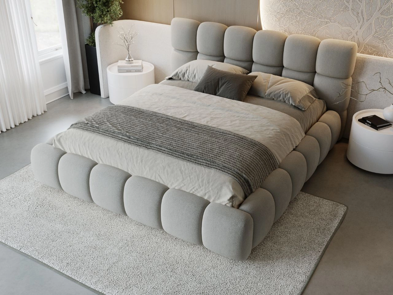 Moderne Bett Modo zieht mit seinem hohen, gepolsterten Kopfteil in Segmentoptik alle Blicke auf sich. Es erfüllt sowohl dekorative als auch funktionale Zwecke – ideal als komfortable Rückenlehne beim Entspannen. Dank seines durchdachten Designs fügt sich das Bett perfekt in minimalistische und zeitgenössische Einrichtungen ein und verleiht ihnen eine elegante, exklusive Note.