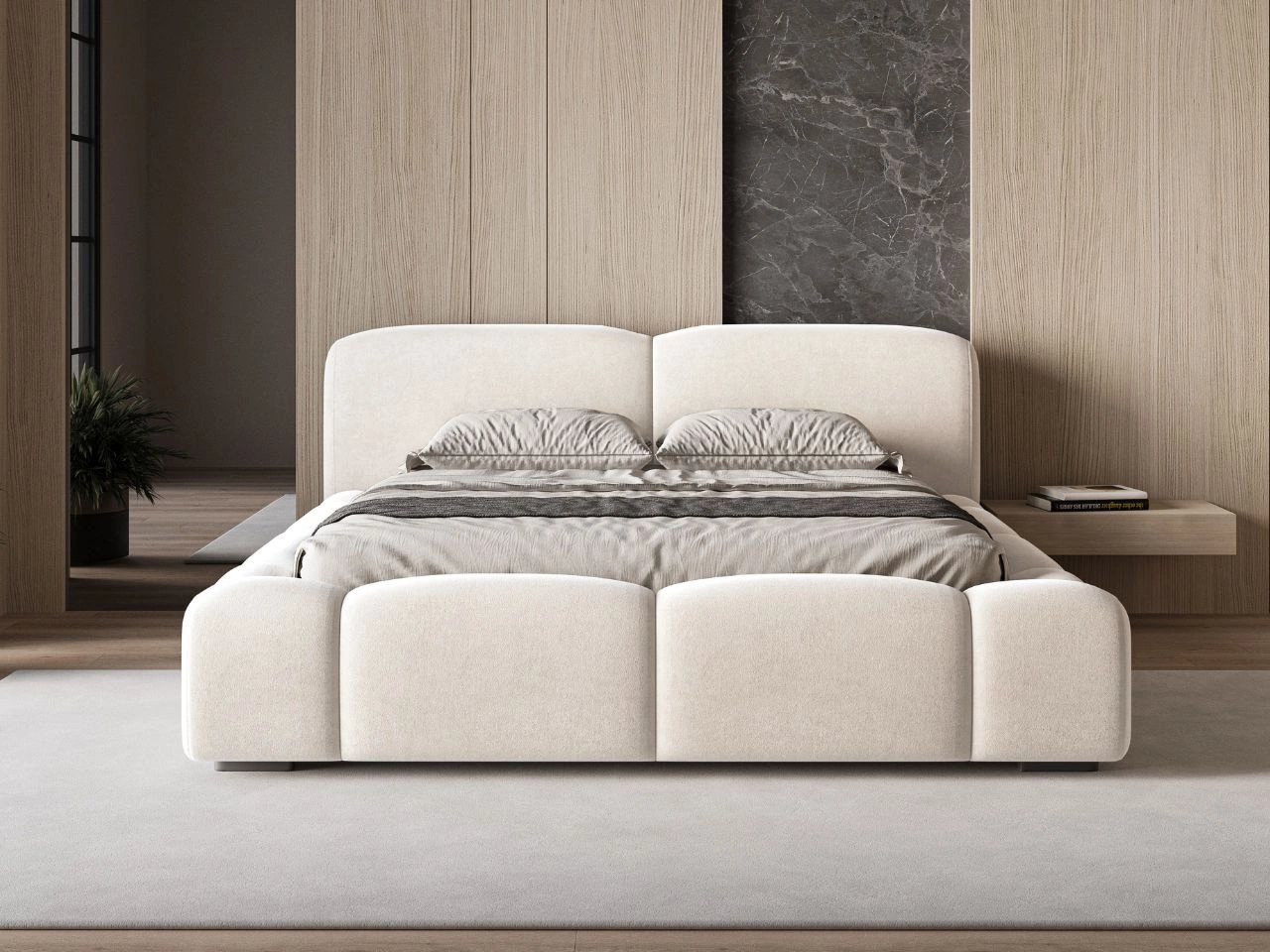 Polsterbett Aubi ist ein modernes Möbelstück mit skulpturaler Form, das sich durch seine leicht abgerundete Silhouette und die massive Basis auszeichnet. Die weichen Seitenelemente sowie das minimalistische, zweiteilige Kopfteil fügen sich harmonisch in elegante, zeitgemäße Innenräume ein.