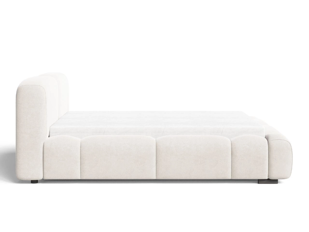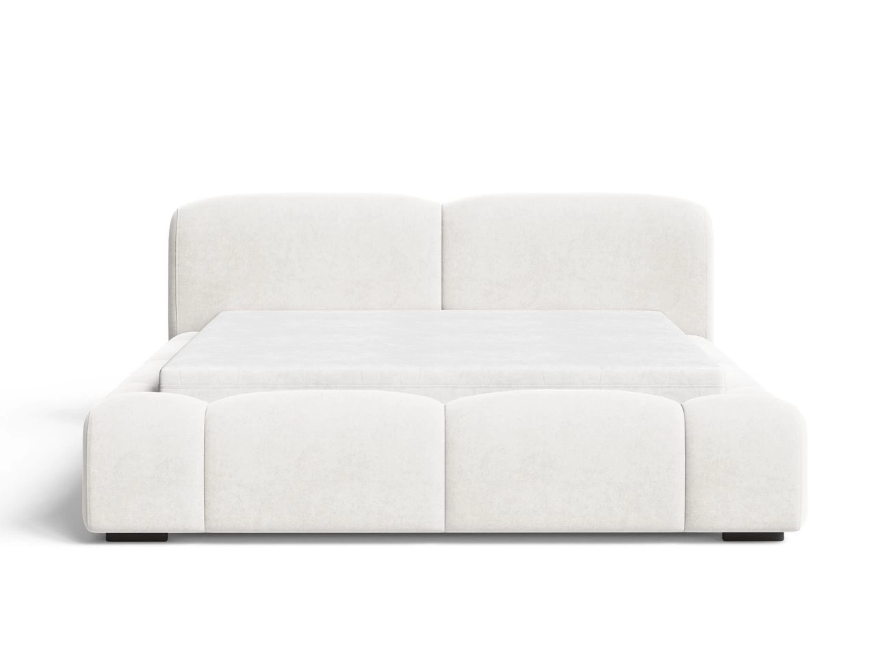 Polsterbett Aubi ist ein modernes Möbelstück mit skulpturaler Form, das sich durch seine leicht abgerundete Silhouette und die massive Basis auszeichnet. Die weichen Seitenelemente sowie das minimalistische, zweiteilige Kopfteil fügen sich harmonisch in elegante, zeitgemäße Innenräume ein.