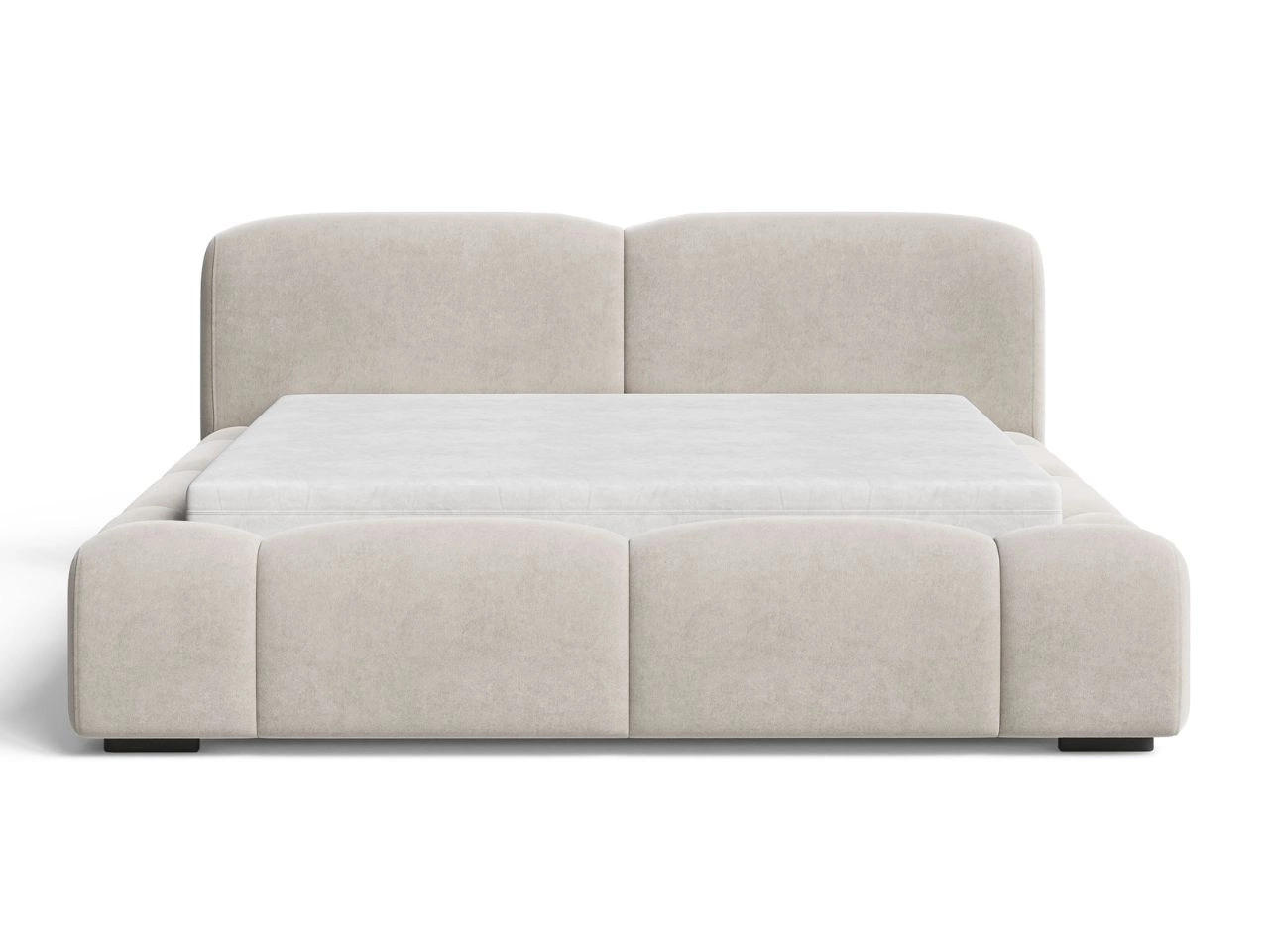 Polsterbett Aubi ist ein modernes Möbelstück mit skulpturaler Form, das sich durch seine leicht abgerundete Silhouette und die massive Basis auszeichnet. Die weichen Seitenelemente sowie das minimalistische, zweiteilige Kopfteil fügen sich harmonisch in elegante, zeitgemäße Innenräume ein.
