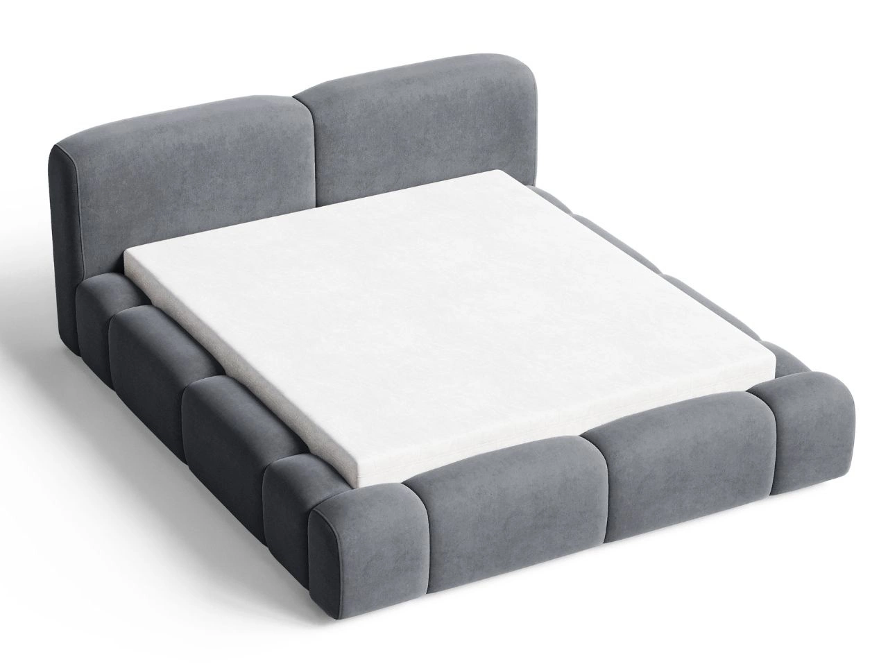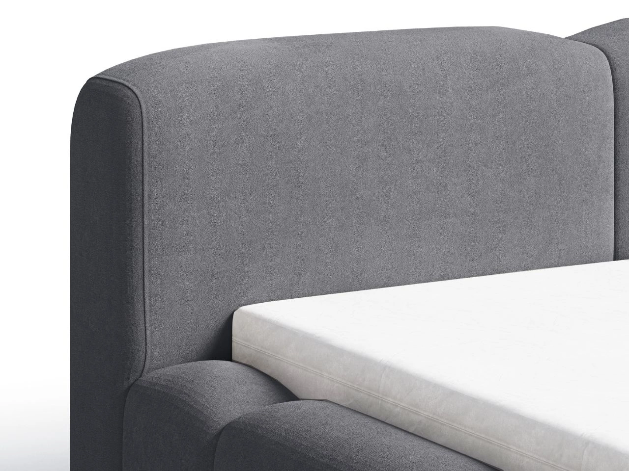 Polsterbett Aubi ist ein modernes Möbelstück mit skulpturaler Form, das sich durch seine leicht abgerundete Silhouette und die massive Basis auszeichnet. Die weichen Seitenelemente sowie das minimalistische, zweiteilige Kopfteil fügen sich harmonisch in elegante, zeitgemäße Innenräume ein.