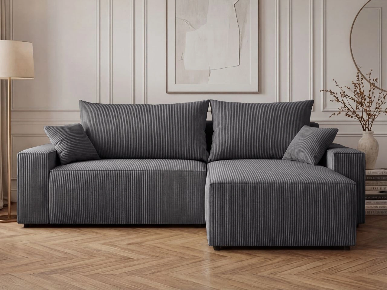 Modell Nivo wurde mit Blick auf täglichen Komfort und maximale Funktionalität entworfen. Es verfügt über eine praktische Schlaffunktion, die das Sofa im Handumdrehen in eine bequeme Liegefläche verwandelt, sowie über einen Bettkasten – ideal zur Aufbewahrung von Decken, Kissen oder anderen Textilien. Die Sitzfläche besteht aus Wellenfedern und PUR-Schaum, was für hohen Sitzkomfort und eine stabile Unterstützung sorgt. Dank der universellen Ottomane kann die Ecke beim Aufbau flexibel auf die rechte oder linke Seite gesetzt werden, wodurch sich das Sofa optimal an verschiedene Raumlayouts anpasst.