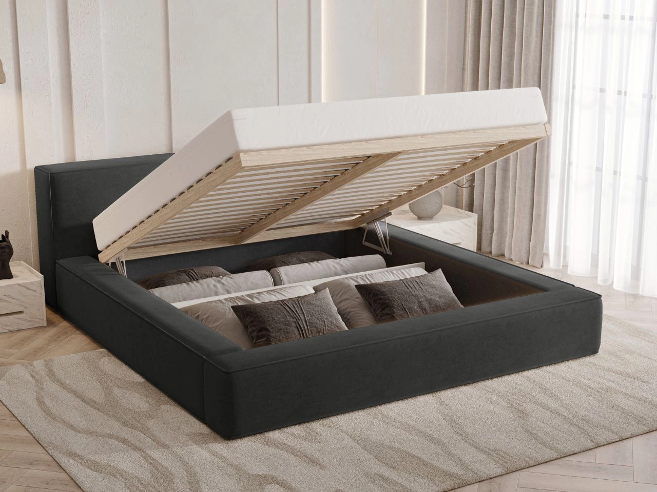 Moderne Bett Mali wurde für höchsten Alltagskomfort konzipiert. Der integrierte, geräumige Bettkasten unter dem Holzlattenrost (Matratze nicht im Lieferumfang enthalten) hilft dabei, Ordnung im Schlafzimmer zu halten. Ein Federmechanismus erleichtert das Anheben des Rahmens, sodass der Zugang zum Stauraum mühelos und schnell erfolgt. Eine ideale Lösung für alle, die stilvolle und zugleich praktische Möbel schätzen.