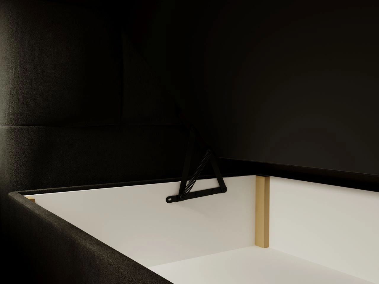 Besonders praktisch ist der integrierte doppelte Bettkasten, der großzügigen Stauraum für Bettwäsche, Decken oder Kleidung bietet. Der federunterstützte Öffnungsmechanismus macht das Anheben leicht und komfortabel – ohne körperlichen Aufwand.