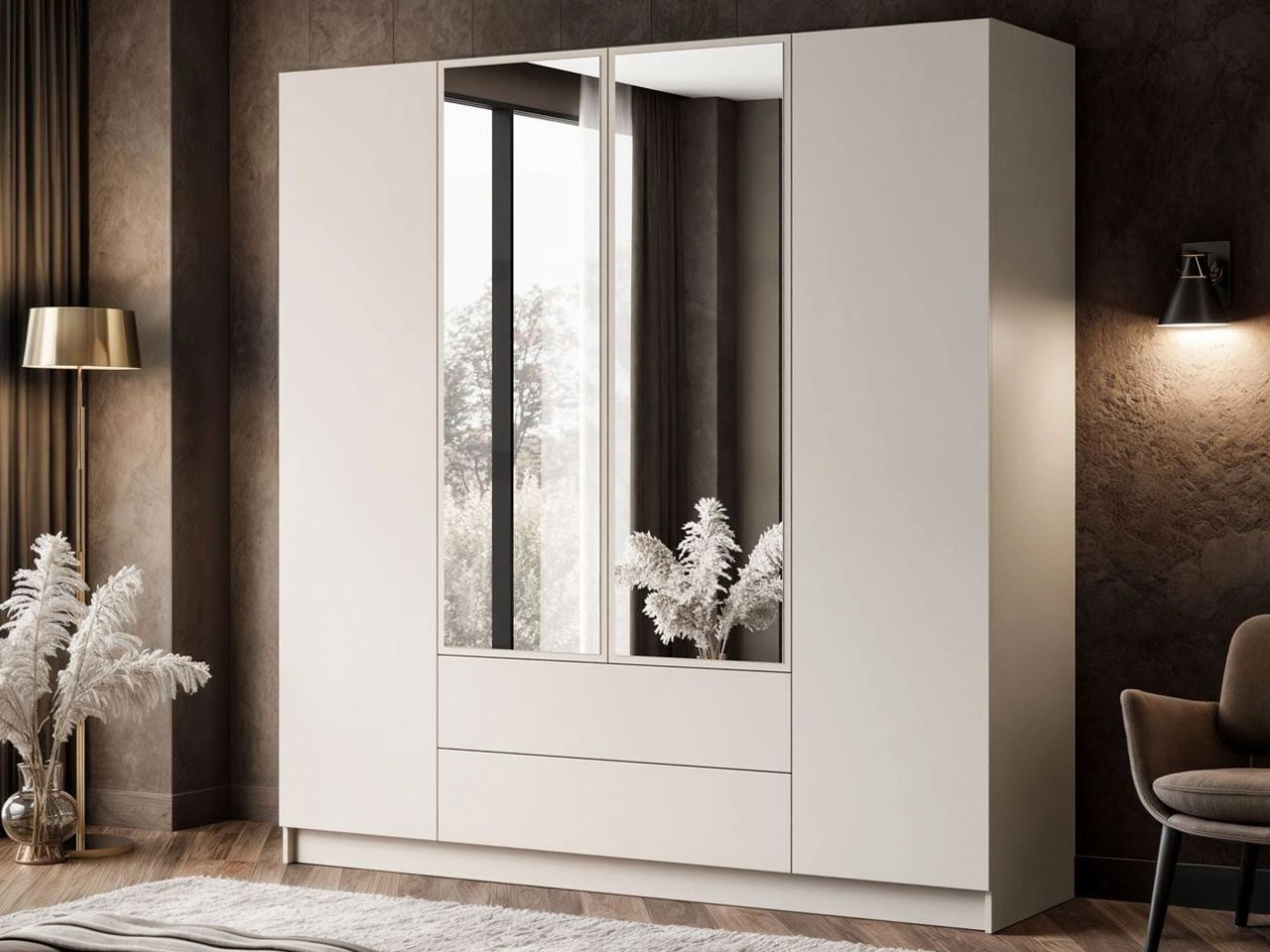 Viertürige Ameli Schrank mit Spiegeln besitzt einen Korpus aus hochwertiger, laminierter Möbelplatte in neutralem Kaschmirton, der perfekt mit den glatten, matten Fronten harmoniert, auf denen zwei Spiegel angebracht sind und so ein stimmiges, dezentes Gesamtbild schaffen. Der Schrank ist mit einem modernen PUSH-TO-OPEN-System ausgestattet, das es ermöglicht, den Schrank durch leichtes Drücken der Front ohne Griffe zu öffnen. Der Federmechanismus drückt die Front nach vorne, und durch erneutes Drücken wird das Möbelstück geschlossen und arretiert, wodurch es gleichzeitig einen modernen Charakter und ein edles Erscheinungsbild durch den Verzicht auf Griffe erhält. Die Kanten des Schranks sind mit ABS-Kante versehen, die sie vor Beschädigungen, Feuchtigkeit und Abrieb schützt und so die Langlebigkeit sowie das ästhetische Erscheinungsbild langfristig erhält.