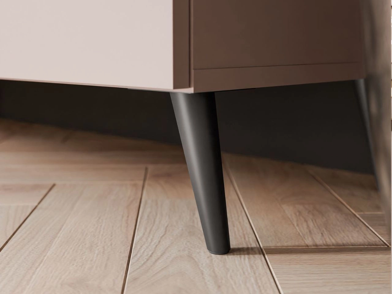 Feine Griffe sorgen für ein komfortables Öffnen der Fronten und unterstreichen gleichzeitig den modernen Stil des Möbels sowie seine klare, minimalistische Linienführung. Die Konstruktion ruht auf hohen, schlanken und leicht schräg gestellten Metallfüßen, die dem Gesamtbild visuelle Leichtigkeit verleihen, die Reinigung erleichtern und eine praktische Nutzung des Bereichs unter dem Möbel ermöglichen.