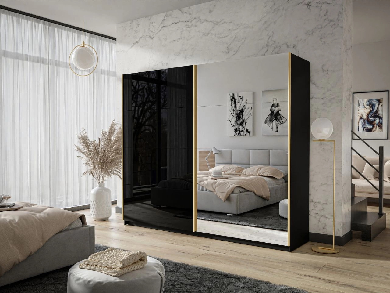 Eine Tür des Schranks ist vollständig mit einem Spiegel versehen, der den Raum optisch vergrößert und Tiefe verleiht, während die andere Tür in schwarzem Hochglanz ausgeführt ist, wodurch ein eleganter Kontrast entsteht und der moderne Charakter des Möbelstücks betont wird. Goldene Akzente entlang der Kanten verleihen zusätzliche Eleganz, und stabile Führungsschienen sorgen für ein sanftes Verschieben der Türen.