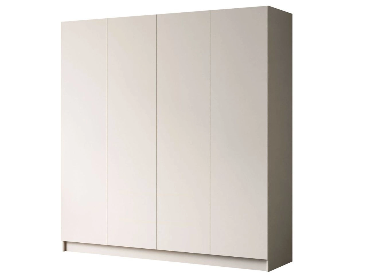 Viertürige Kleiderschrank Ameli verfügt über einen Korpus aus hochwertiger laminierter Möbelplatte in einem neutralen Kaschmirfarbton, der perfekt mit den glatten, matten Fronten harmoniert und ein stimmiges, dezentes Gesamtbild schafft. Der Schrank ist mit einem modernen PUSH-TO-OPEN-System ausgestattet, das ein leichtes Öffnen durch sanftes Drücken der Front ermöglicht – ganz ohne Griffe. Der Federmechanismus drückt die Front nach vorne, ein erneutes Andrücken schließt und verriegelt das Möbelstück. So erhält der Schrank einen modernen Charakter und elegante Ausstrahlung durch den Verzicht auf Griffe. Die Kanten sind mit ABS-Umleimung versehen, die sie vor Beschädigungen, Feuchtigkeit und Abrieb schützt und für eine lange Lebensdauer sowie ein gepflegtes Erscheinungsbild sorgt.