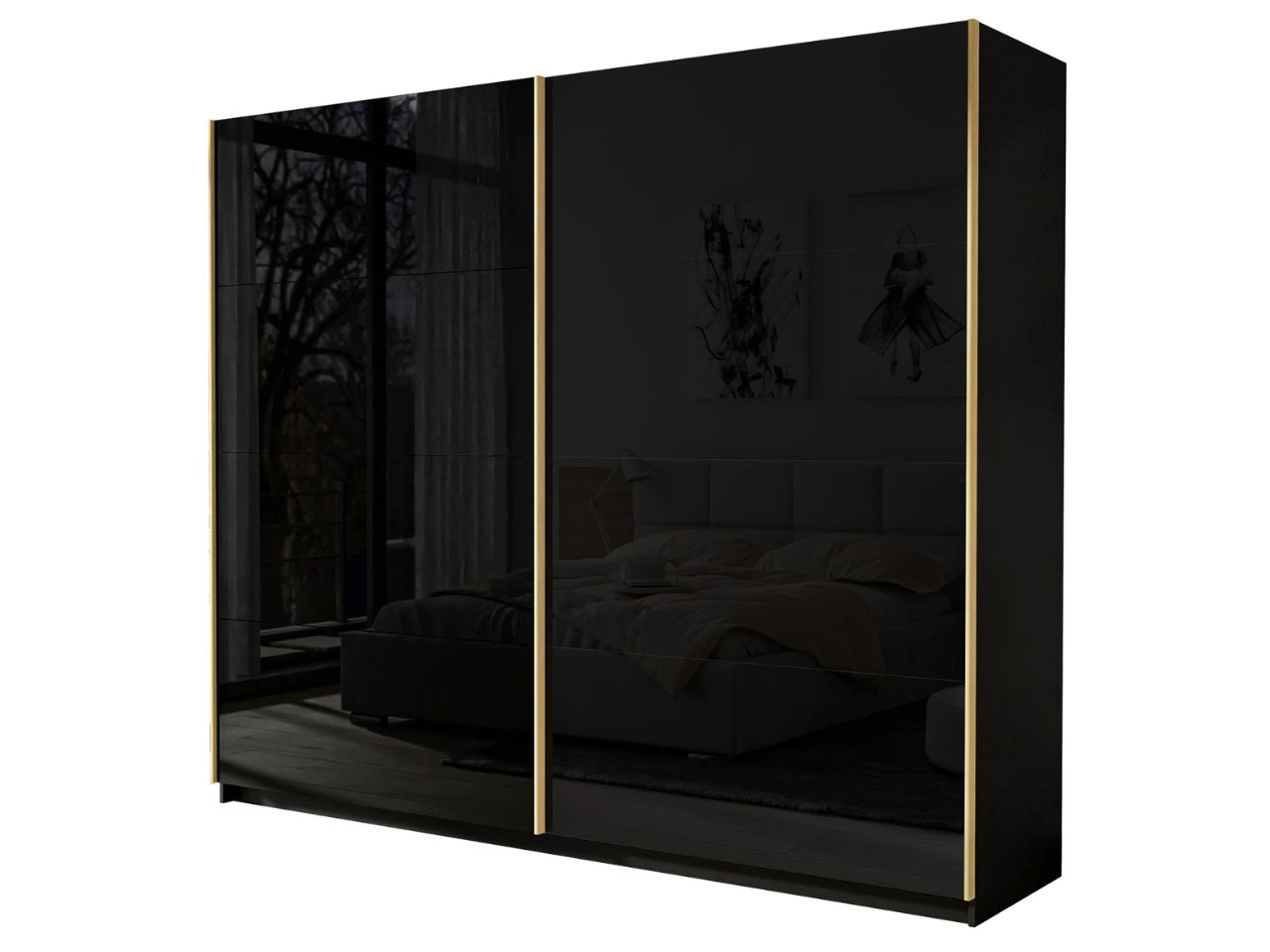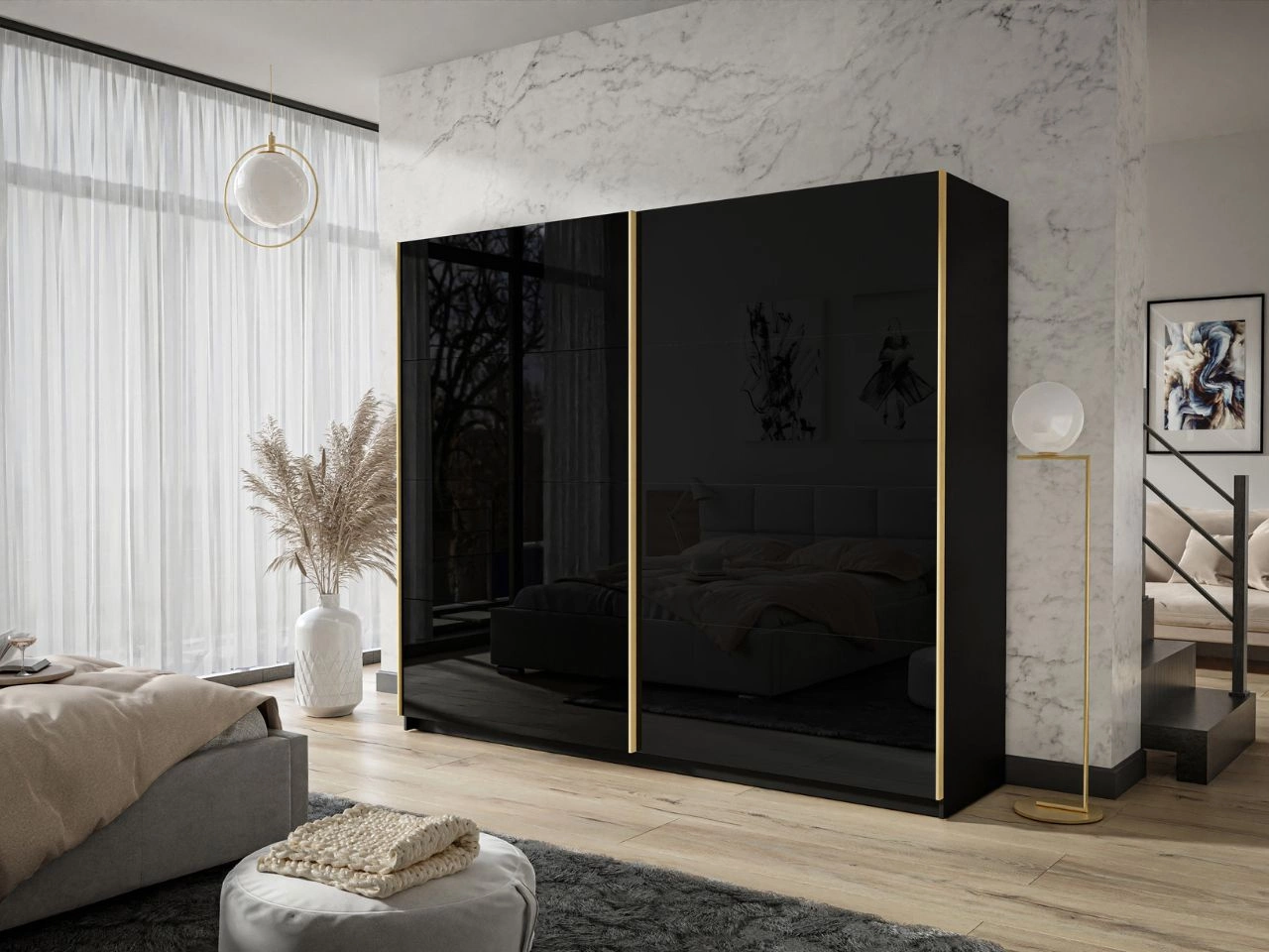 Gesamte Schrank ist in schwarzem Hochglanz gehalten, was ihm einen eleganten und modernen Charakter verleiht. Goldene Akzente entlang der Kanten verleihen zusätzliche Eleganz, und stabile Führungsschienen sorgen für ein sanftes Verschieben der Türen.