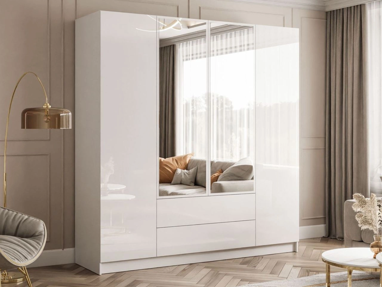 Viertürige Kleiderschrank Ameli mit Spiegeln verfügt über einen Korpus aus hochwertiger laminierter Möbelplatte in Weiß, der perfekt mit den glatten, hochglänzenden Fronten harmoniert. Auf zwei der Türen sind Spiegel angebracht, wodurch ein stimmiges, dezentes Gesamtbild entsteht. Der Schrank ist mit einem modernen PUSH-TO-OPEN-System ausgestattet, das ein leichtes Öffnen durch sanftes Drücken der Front ermöglicht – ganz ohne Griffe. Der Federmechanismus drückt die Front nach vorne, ein erneutes Andrücken schließt und verriegelt das Möbelstück. So erhält der Schrank einen modernen Charakter und elegante Ausstrahlung durch den Verzicht auf Griffe. Die Kanten sind mit ABS-Umleimung versehen, die sie vor Beschädigungen, Feuchtigkeit und Abrieb schützt und für eine lange Lebensdauer sowie ein gepflegtes Erscheinungsbild sorgt.